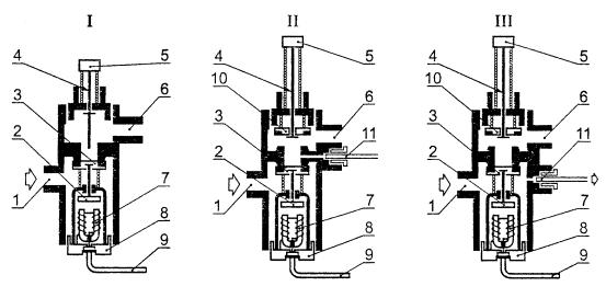 2.4.2 Резьбовые соединения трубопроводов 2.4.2.1 Накидные гайки соединений трубопроводов при сборке на изделиях затягивают ключами по ГОСТ 2839 или ГОСТ 2841, накидные гайки для ответственных соединений - тарировочными ключами. 2.4.2.2 Применяемые трубные резьбы - по ГОСТ 6357, ГОСТ 6211 и таблице 1. 2.4.3 Фланцы Присоединительные фланцы устройства контроля пламени должны соответствовать ГОСТ 12815 для номинального (условного) давления PN 0,6 (6,0) или PN 1,6 (16,0) МПа (кгс/см2). Допускают фланцы другой конструкции, других исполнений уплотнительных поверхностей с обязательным соблюдением присоединительных размеров. 2.5 УплотненияНабивки сальника, используемые для герметизации движущихся частей устройства контроля пламени, должны быть изготовлены и отрегулированы только изготовителем устройства контроля пламени. 2.6 Штуцеры для измерения давления газаНаружный диаметр штуцера должен быть 9-0,5, длина штуцера - 10 мм. Диаметр внутреннего отверстия должен быть не более 1 мм. 2.7 РозжигВ зависимости от конструкции устройство контроля пламени в положении розжига должно обеспечивать выполнение следующих требований: 1) для однопроводного устройства контроля пламени проход газа к основной горелке должен быть открыт; 2) для двухпроводного устройства контроля пламени проход газа к основной горелке должен быть закрыт, а к запальной открыт. Типы (I, II, III) термоэлектрических устройств контроля пламени в закрытом, открытом положениях и в положении розжига приведены на рисунках А.1 и А.2. 3 ТРЕБОВАНИЯ БЕЗОПАСНОСТИ3.1 Общие положенияВыполнение требований 3.1.2, 3.2 - 3.9 проверяют в условиях испытаний по разделу 4. 3.1.1 Установка, использование и ввод в эксплуатацию устройства контроля пламени - в соответствии с руководством по эксплуатации изготовителя и [1], [2]. 3.1.2 Температура окружающей среды Устройство контроля пламени должно надежно работать при температуре окружающей среды, указанной в инструкции по эксплуатации. При этом максимальная температура окружающей среды должна быть не ниже 60 °С, а минимальная - не выше 0 °С. 3.2 ГерметичностьУстройство контроля пламени считают герметичным, если при проведении испытаний по 4.2.2 и 4.2.3 максимально допустимые утечки не превышают значений, указанных в таблице 2. Таблица 2