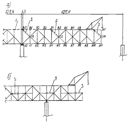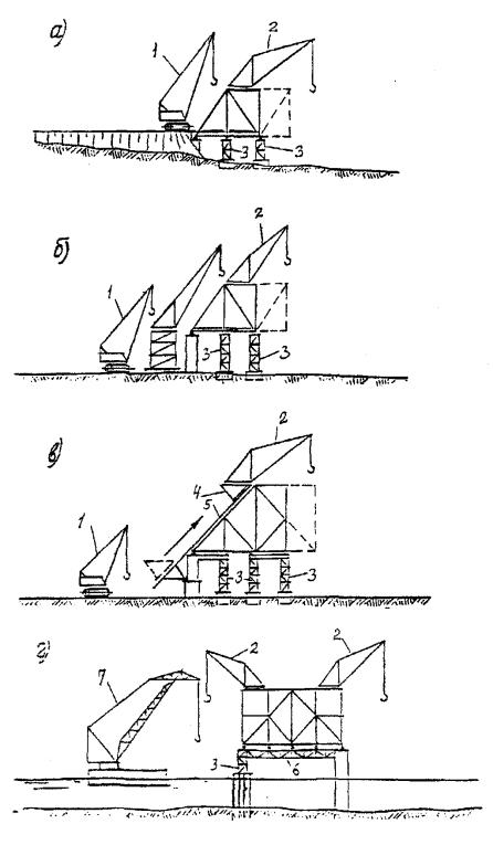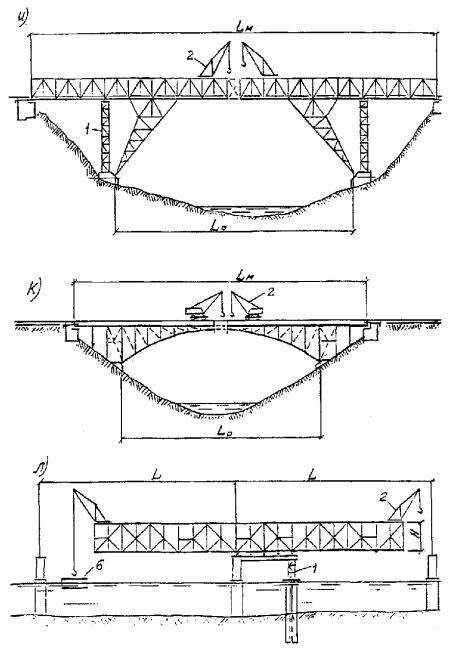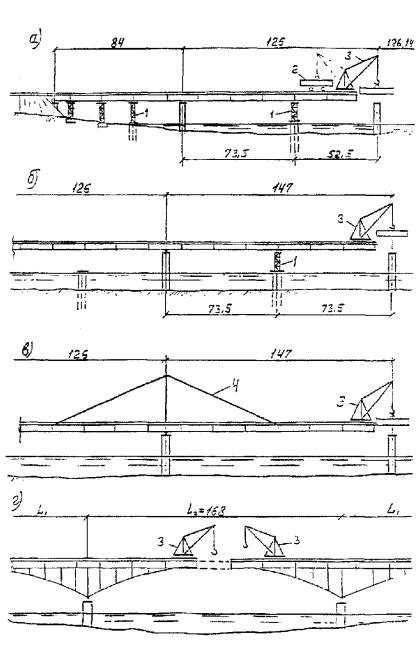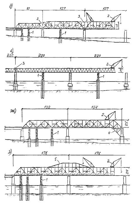 Рис. 1. Схемы навесного монтажа решетчатых пролетных строений. 1 - временная опора; 2 - монтажный кран; 3 - соединительные элементы; 4 - приемная консоль; 5 - шпренгель; 6 - плашкоут для подачи элементов конструкций на сборку Рис. 2. Схемы навесного монтажа сплошностенчатых пролетных строений. 1 - временная опора; 2 - монтируемый элемент на транспортном средстве; 3 - монтажный кран; 4 - шпренгель Для обеспечения общей устойчивости системы против опрокидывания в необходимых случаях следует применять пригрузы (противовесы) или заанкеривание за капитальные опоры мостового сооружения. Монтаж металлической части сталежелезобетонных пролетных строений должен выполняться, как правило, методами, обеспечивающими воспринятие монтажных нагрузок без включения в работу железобетонной плиты. Устойчивость сжатых элементов следует обеспечивать своевременной установкой постоянных или временных связей. 7 Монтажные краны, специальные вспомогательные сооружения и устройства7.1 Для навесного монтажа стальных пролетных строений следует применять, как правило, специальные монтажные краны и агрегаты, позволяющие подвешивать к ним передвижные подмости. Наибольшее применение находят жестконогие неполноповоротные деррик-краны с четырех- или трехточечным опиранием (приложение А). Для сборки типовых пролетных строений с решетчатыми фермами железнодорожных мостов наряду с деррик-кранами можно применять специальные агрегаты типов МАС-5 и MAC-16. Для сборки пролетных строений со сплошностенчатыми главными балками с ездой поверху применяют также полноповоротные стреловые краны на гусеничном или пневмоколесном ходу. 7.2 Краны перечисленных в п. 7.1 типов, перемещаемые по монтируемому пролетному строению и постоянно находящиеся по статической схеме на конце консоли, создают дополнительные изгибающие моменты и напряжения в корне консоли. Для облегчения работы конструкции и, как следствие, увеличения длины консоли и уменьшения числа временных промежуточных опор применяют козловые или стреловые краны, устанавливаемые на плаву, грунте или специальных подкрановых эстакадах. Целесообразность такой установки кранов подлежит обоснованию технико-экономическими расчетами с учетом местных условий. На плавсредствах можно устанавливать любые стреловые, в том числе деррик-краны, или использовать специальные плавучие краны. 7.3 При монтаже пролетных строений разной высоты или с полигональным очертанием верхнего пояса деррик-краны, устанавливаемые на верхних поясах, должны иметь устройства для приведения собственной рамы в горизонтальное положение, либо они должны устанавливаться в уровне проезжей части пролетных строений на специальных подставках. 7.4 Деррик-краны, устанавливаемые на пролетных строениях или на плашкоутах, должны иметь захваты в точках опирания для воспринятия отрицательных реакций (отрыва) при любом угле поворота стрелы с любым допускаемым по силовой характеристике крана грузом. В паспорте деррик-крана должны быть приведены данные по опорным реакциям и указания по способу их воспринятия. Элементы пролетного строения, непосредственно воспринимающие давление от опорных точек или ходовых частей крана при его перемещении или работе, должны быть рассчитаны на местную нагрузку. При этом не допускается учитывать неразрезность поясов решетч