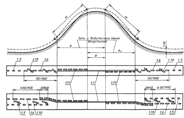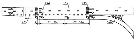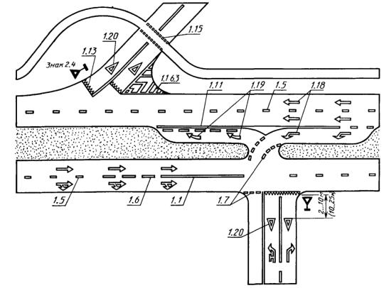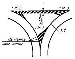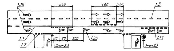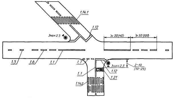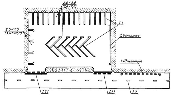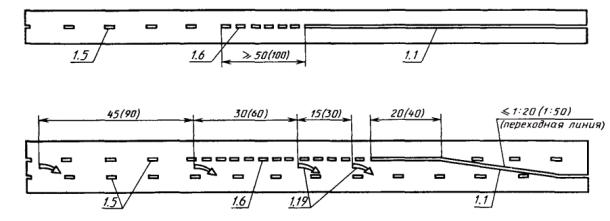 2. Для обозначения границ полос движения при их числе две или более для одного направления движения: - перед перекрестками, пешеходными переходами и железнодорожными переездами не менее чем за 20 (40) м от разметки 1.12 или 1.13 (черт. 4, 5); - при необходимости выделить на проезжей части полосу для маршрутных транспортных средств (черт. 12). 3. Для обозначения границ участков проезжей части, на которые въезд запрещен (островки безопасности, остановочные площадки и т.п.) (черт. 7, 13). 4. Для обозначения границ стояночных мест транспортных средств (черт. 8). При этом минимальные размеры одного стояночного места при последовательном размещении автомобилей вдоль края проезжей части должны быть 2,5´7,5 м для легковых и 3,0 и 10,0 м - для грузовых автомобилей, а при параллельном размещении автомобилей по отношению друг к другу - соответственно 2,5´5,0 м и 3,0´7,0 м. 5. Для обозначения края проезжей части (краевая линия) на дорогах, при ширине проезжей части более 6,5 м и не обозначенных знаком 5.1 «Автомагистраль» (черт. 13). Разметку следует наносить на расстоянии 0,2 м от края проезжей части. При наличии бордюра краевую линию допускается не наносить, за исключением опасных участков дорог. 3.2.2, 3.2.3. (Измененная редакция, Изм. № 1). 3.2.4. Разметка 1.2 должна применяться для обозначения края проезжей части (краевая линия) на дорогах, обозначенных знаком 5.1 «Автомагистраль». Разметку следует наносить на расстоянии 0,2 м от края проезжей части. 3.2.5. Разметка 1.3 должна применяться для разделения транспортных потоков противоположных направлений (осевая линия) на дорогах, имеющих четыре и более полос движения в обоих направлениях (черт. 4, 5). 3.2.6. Разметка 1.4 должна применяться на участках дорог, где запрещена остановка транспортных средств. Разметку следует наносить на расстоянии 0,1 м от края проезжей части или по верху бордюра (черт. 8). 3.2.7. Разметка 1.5 должна применяться для: - разделения транспортных потоков противоположных направлений (осевая линия) на дорогах, имеющих две или три полосы движения в обоих направлениях (черт. 1 - 3, 5, 6, 8, 9, 11, 13), кроме случаев, указанных в пп. 3.2.3 и 3.2.13; - обозначения границ полос движения при их числе две или более для одного направления движения (черт. 4 - 6, 9, 10 - 12), кроме случаев, указанных в пп. 3.2.3 и 3.2.13. 3.2.8. Разметка 1.6 должна применяться для обозначения приближения (линия приближения) к разметке 1.1 или 1.11, разделяющей транспортные потоки противоположных (черт. 1 - 3, 5, 6) или попутных (черт. 4, 5, 9) направлений, и наноситься на расстоянии не менее 50 (100) м перед ними. 3.2.9. Разметка 1.7 должна применяться для обозначения полос движения в пределах перекрестка в случаях, когда необходимо показать траекторию движения транспортных средств или подчеркнуть границу полосы движения (черт. 3, 4, 9, 12). 3.2.10. Разметка 1.8 должна применяться для обозначения границы между полосой разгона или торможения и основной полосой движения (черт. 10). При этом ширина разметки должна быть 0,4 м на автомагистралях и 0,2 м на других дорогах. 3.2.11. Разметка 1.9 (реверсивная линия) должна применяться для: - обозначения границ полос движения, предназначенных для реверсивного регулирования (черт. 11); - разделения транспортных потоков противоположных направлений на участках дорог, где используется реверсивное регулирование (при выключенных реверсивных светофорах), 3.2.12. Разметка 1.10 должна применяться на участках доро