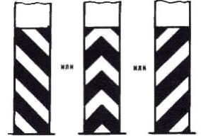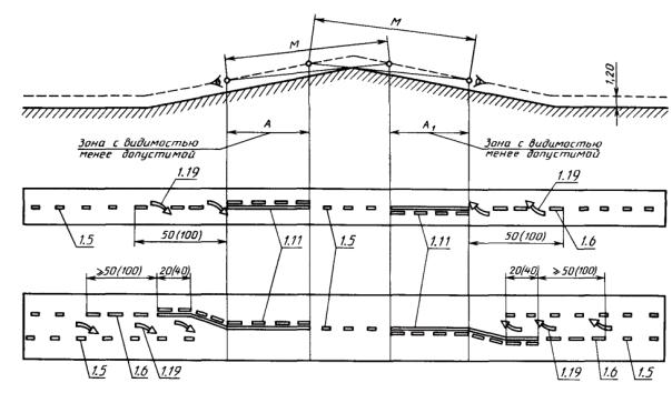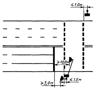 - на прямолинейных участках дорог при высоте насыпи не менее 2 м и интенсивности движения не менее 1000 ед./сут - через 50 м; - в пределах кривых на перекрестках - на расстояниях, указанных в табл. 11 для внешней стороны кривой; - при промежуточных значениях радиусов кривых в плане и продольном профиле, кратных 5 или 50 м (табл. 10, 11), - значения расстояний между столбиками следует определять интерполяцией: - на дорогах, расположенных на расстоянии до 15 м от болот и водотоков глубиной от 1 до 2 м, - через 10 м; - у мостов и путепроводов - по три столбика с обеих сторон дороги до и после сооружения, через 10 м; - у водопропускных труб - по одному столбику с каждой стороны дороги вдоль оси трубы и по три столбика с обеих сторон дороги до и после сооружения через каждые 10 м, если диаметр трубы 1,5 м и больше, и по одному столбику, если диаметр трубы меньше 1,5 м. 5.3.2. Направляющие столбики должны устанавливаться на обочине на расстоянии 0,35 м от бровки земляного полотна, при этом расстояние от края проезжей части до столбика должно составлять не менее 0,75 м. 5.3.3. Тумбы с искусственным освещением должны устанавливаться в населенных пунктах в начале разделительной полосы и перед торцевыми частями подпорных стенок транспортного тоннеля, а также на приподнятых островках безопасности и направляющих островках. Тумбы могут не устанавливаться при наличии на указанных элементах освещаемых дорожных знаков или светофоров. 5.3.4. Направляющие островки должны устраиваться при суммарной интенсивности движения на перекрестках не менее 1000 ед./сут, когда число поворачивающих транспортных средств составляет не менее 10 % на дорогах вне населенных пунктов и не менее 20 % - в населенных пунктах. 5.3.5. Островки безопасности должны устраиваться на наземных пешеходных переходах при интенсивности движения транспортных средств не менее 400 ед./ч на одну полосу проезжей части и расстоянии между тротуаром и краем островка не менее 7,5 м для размеченных островков и не менее 10,5 м - при наличии защитных элементов (рефюжей). М - минимальное расстояние видимости, обеспечивающее безопасность движения при данной скорости, м. Черт. 1 М - минимальное расстояние видимости, обеспечивающее безопасность движения при данной скорости, м. Черт. 2 Черт. 3 Черт. 4 Черт. 5 Черт. 6 Черт. 7 Черт. 8 Черт. 9 Черт. 10 Черт. 11 Черт. 12 Черт. 13 Черт. 14