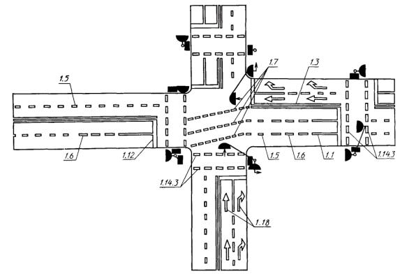 Условие 2. В течение 8 ч (суммарно) рабочего дня недели интенсивность движения не менее: - 600 ед./ч (для дорог с разделительной полосой 1000 ед./ч) по главной дороге в двух направлениях; - 150 пешеходов пересекают проезжую часть в одном, наиболее загруженном направлении в каждый из тех же 8 ч. Для населенных пунктов с численностью жителей менее 10 тыс. чел. нормативы по условиям 1 и 2 составляют 70 % указанных. Условие 3. Условия 1 и 2 одновременно выполняются по каждому отдельному нормативу на 80 % и более. Условие 4. За последние 12 мес на перекрестке совершено не менее трех дорожно-транспортных происшествий, которые могли бы быть предотвращены при наличии светофорной сигнализации (например, столкновения транспортных средств, движущихся с поперечных направлений, наезды транспортных средств на пешеходов, переходящих дорогу, столкновения между транспортными средствами, движущимися в прямом направлении и поворачивающими налево со встречного направления). При этом условия 1 или 2 должны выполняться на 80 % или более. 4.16. Транспортные светофоры типов 1, 2, 9 (или 3) и пешеходные светофоры допускается применять и в случаях, не предусмотренных пп. 4.14 и 4.15, при соответствующем технико-экономическом обосновании. 4.15, 4.16. (Измененная реакция, Изм № 1). 4.17. Целесообразность введения реверсивного регулирования с использованием транспортных светофоров типа 4 должна рассматриваться при одновременном наличии следующих условий: - интенсивность движения транспортных средств в часы пик составляет более 500 ед./ч на полосу движения в более загруженном направлении; - суммарная интенсивность движения транспортных средств в более загруженном направлении превышает интенсивность встречного движения более чем на 500 ед./ч; - указанная неравномерность движения систематически изменяется по направлениям в течение суток или по дням недели; - проезжая часть дороги имеет три и более полосы движения в обоих направлениях. 4.18. Необходимость установки транспортных светофоров типов 6 и 10 на железнодорожных переездах определяется соответствующей нормативно-технической документацией, утвержденной МПС. (Измененная редакция, Изм. № 1). 4.19. Транспортные светофоры типа 7 должны применяться при следующих условиях: - не обеспечена видимость опасного участка на расстоянии, достаточном для остановки транспортного средства при движении со скоростью, допустимой на предыдущем участке дороги, и - интенсивность движения транспортных средств и пешеходов на обозначаемом участке составляет более 50 % от норм для условий 1 и 2 п. 4.14. 4.20. При наличии на дороге нескольких проезжих частей, предназначенных для движения в одном направлении и отделенных друг от друга разделительными полосами, для регулирования движения по каждой из них должен применяться самостоятельный светофор (черт. 19). 4.21. Размещение дорожных светофоров (кроме транспортных типов 3, 9 и пешеходных) должно обеспечивать видимость их сигналов с расстояния не менее 100 м с любой полосы движения, на которую распространяется их действие. В противном случае должны предварительно устанавливаться дорожные знаки 1.8 «Светофорное регулирование». Для улучшения видимости дополнительной секции светофоры исполнений Т.1.п, Т.1.л, Т.1.пл должны быть оборудованы экранами белого цвета прямоугольной формы с закругленными углами и выступать за габариты све