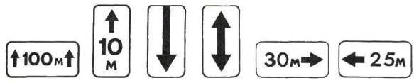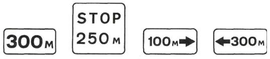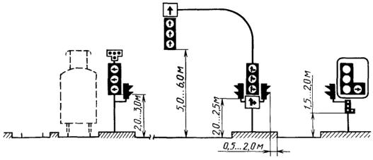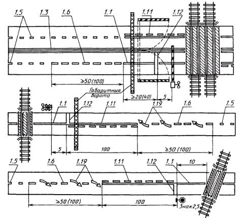 Высота установки знаков, расположенных сбоку от дороги, определяется от поверхности дорожного покрытия на краю проезжей части. При расположении знаков друг под другом высота установки определяется по нижнему знаку. На протяжении одной дороги высота установки знаков должна быть по возможности одинаковой. 2.1.12. Расстояние между соседними знаками, размещенными на одной опоре и распространяющими свое действие на одну и ту же проезжую часть, за исключением знаков, выполненных в одном корпусе, должно составлять от 50 до 200 мм. 2.1.13. Знаки не должны устанавливаться на расстоянии менее 1 м от проводов сети высокого напряжения. В пределах охранной зоны высоковольтных линий подвеска знаков на тросах-растяжках запрещается. 2.1.14. Типоразмеры знаков и высота прописной буквы hn на информационно-указательных знаках индивидуального проектирования в зависимости от условий применения должны выбираться в соответствии с ГОСТ 10807. Если для данных условий движения типоразмер знака не оговорен, должны применяться знаки ближайшего типоразмера. 2.2. Предупреждающие знаки 2.2.1. Предупреждающие знаки применяют для информирования участников движения о характере опасности и расположении опасного участка дороги, движение по которому требует принять меры, соответствующие обстановке. 2.2.2. Вне населенных пунктов предупреждающие знаки, кроме знаков 1.3.1 - 1.4.6, 1.31.1 - 1.31.3, в зависимости от скорости движения, условий видимости и возможности размещения должны устанавливаться на расстоянии от 150 до 300 м, а в населенных пунктах - на расстоянии от 50 до 100 м от начала опасного участка. При необходимости (начало опасного участка скрыто от водителя крутым поворотом, переломом продольного профиля, зданием и т.п.) допускается устанавливать предупреждающие знаки на ином расстоянии, указываемом в этом случае на табличке 7.1.1. 2.2.3. Если между предупреждающим знаком и началом опасного участка имеется перекресток, за этим перекрестком допускается устанавливать повторный предупреждающий знак с табличкой 7.1.1. Если расстояние между началом опасного участка и перекрестком менее 20 м, то на пересекающей дороге допускается устанавливать соответствующий знак с табличкой 7.1.3 или 7.1.4 на расстоянии до 50 м от перекрестка. 2.2.4. Знаки 1.1, 1.2, 1.9, 1.10, 1.21, 1.23 должны повторяться вне населенных пунктов, а знаки 1.21, 1.23 - и в населенных пунктах. Второй знак должен быть установлен на расстоянии не менее 50 м от начала опасного участка. 2.2.5. Знаки 1.1 «Железнодорожный переезд со шлагбаумом» и 1.2 «Железнодорожный переезд без шлагбаума» должны устанавливаться перед всеми железнодорожными переездами, соответственно оборудованными или необорудованными шлагбаумами. Знаки 1.1 и 1.2 должны дублироваться на дорогах с тремя и более полосами для движения в обоих направлениях, а также на дорогах с одной или двумя полосами для движения в обоих направлениях, если расстояние видимости переезда вне населенных пунктов менее 300 м, а в населенных пунктах - менее 100 м. Если дорога пересекает переезды, расстояние между которыми менее 50 м, то знаки 1.1 или 1.2 должны устанавливаться только перед первым переездом, в остальных случаях - перед каждым переездом. Если дорога проходит параллельно железной дороге на расстоянии от 20 до 50 м, то на пересекающей их дороге следует дополнительно установить знак 1.1 или 1.2 с табличкой 7.1.1. Если рас