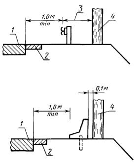 Примечание. Допускается вместо установки дорожных ограждений по согласованию с землепользователями устраивать откосы насыпей крутизной 1:4 при интенсивности движения более 2000 ед./сут и 1:3 - при интенсивности движения 2000 ед./сут и менее; - на обочинах дорог, расположенных на склонах местности крутизной более 1:3 (со стороны склона); - на обочинах дорог, расположенных параллельно железнодорожным линиям, болотам и водным потокам глубиной более 2 м, оврагам и горным ущельям на расстоянии до 25 м от края проезжей части, при перспективной интенсивности движения не менее 2000 ед./сут и до 15 м при перспективной интенсивности движения менее 2000 ед./сут; - на обочине или разделительной полосе у опор путепроводов, деревьев с диаметром стволов более 10 см, консольных или рамных опор информационно-указательных дорожных знаков, расположенных на расстоянии менее 4 м от края проезжей части, при перспективной интенсивности движения не менее 2000 ед./сут. (Измененная редакция, Изм. № 1). 5.2.2. Ограждения первой группы должны быть расположены: - с внешней стороны предохранительной полосы мостов, путепроводов, эстакад на расстоянии не менее 1 м от кромки проезжей части; - при отсутствии препятствий - на оси разделительной полосы; - при наличии опор путепроводов, освещения, консольных или рамных опор информационно-указательных дорожных знаков - вдоль оси разделительной полосы, на расстоянии не менее 1 м от кромки проезжей части и не менее величины расчетного поперечного прогиба ограждения* от ограждаемого препятствия (черт. 21, табл. 8); * Расчетный поперечный прогиб барьерного металлического ограждения указан в табл. 8. Измеряют от лицевой поверхности ограждения. - на обочине - ограждения барьерного типа на расстоянии на 0,25 м меньше величины расчетного поперечного прогиба, а ограждения парапетного типа - на расстоянии 0,5 м от бровки земляного полотна (черт. 22); - при наличии на обочине опор путепроводов, освещения, информационно-указательных дорожных знаков допускается установка барьерных металлических ограждений на расстоянии не менее 1 м от кромки проезжей части до лицевой поверхности ограждения и не менее величины расчетного поперечного прогиба до ограждаемого препятствия. Ограждения парапетного типа допускается располагать в соответствии с черт. 23. 5.2.3. При заданном расстоянии от кромки проезжей части до ограждаемого препятствия конструкцию ограждения следует выбирать в соответствии с табл. 8 и 9, исходя из расчетной величины поперечного прогиба (черт. 21, 23). Таблица 8