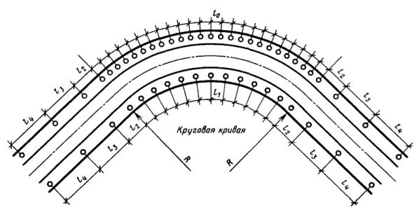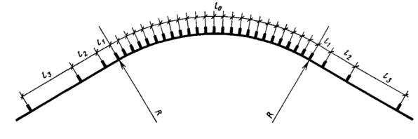 - в пределах кривой в плане и на подходах к ней (по три столбика с каждой стороны дороги) при высоте насыпи не менее 1 м - на расстояниях, указанных в табл. 11 (черт. 25) Таблица 11 м