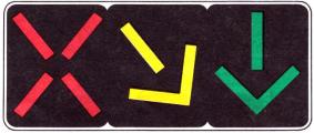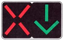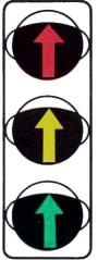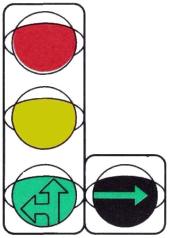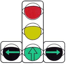* Вариант используют при отсутствии на данном подходе к перекрестку светофоров исполнения Т.2 с сигналами «направо». ** Может применяться только при использовании вариантов в и г размещения основного светофора. *** При регулировании движения трамваев, следующих по обособленному полотну, допускается размещение в междупутье. *4 Допускается устанавливать один светофор типа 7 на центральном островке или подвешивать его над центром перекрестка. (Измененная редакция, Изм. № 1). 4.28. Допускается установка транспортных светофоров типа 2 над каждой соответствующей полосой движения, если режим работы светофорного объекта предусматривает различную длительность и (или) последовательность сигналов для этих полос. Светофоры типа 2 допускается оборудовать табличкой белого цвета с изображением черной стрелки, указывающей направление движения, которое регулируется данным светофором. Табличка должна иметь форму квадрата со стороной 400 мм (см. черт. 19). 4.29. Транспортные светофоры типа 3 должны размещаться под соответствующими светофорами исполнений T.1. T.1.п, Т.1.л. Светофоры типов 3 и 9, используемые для регулирования движения велосипедистов, должны быть установлены справа от велосипедной дорожки на расстоянии от 0,4 до 1,5 м. Светофоры типа 3 должны быть снабжены табличкой белого цвета с черным символом велосипеда, соответствующего ГОСТ 10807. Табличка должна иметь форму квадрата со стороной 200 мм. (Измененная редакция, Изм. № 1). 4.31. Пешеходные светофоры должны размещаться на тротуарах с обеих сторон проезжей части, а при наличии островка безопасности или разделительной полосы - и на них, если число полос движения в одном направлении более четырех. Пешеходными светофорами должны быть оборудованы все пешеходные переходы, расположенные на регулируемом перекрестке. 4.32. Транспортные светофоры типов 1, 2 и 8 следует дублировать, если движение, регулируемое этими светофорами, осуществляется по двум и более полосам и в конкретных условиях невозможно обеспечить выполнение требования распознаваемости сигналов в соответствии с п. 4.25. При наличии светофоров типа 3 светофоры исполнений T.1.п, T.1.л допускается не дублировать. Транспортные светофоры типа 2, расположенные над проезжей частью, не дублируют. (Измененная редакция, Изм. № 1). 4.33. Все светофоры, установленные на одном светофорном объекте (кроме светофоров типа 4), должны работать во взаимозависимых режимах. Любой светофорный объект, входящий в систему координированного регулирования движения, должен иметь возможность работать в индивидуальном автоматическом режиме, независимо от работы других светофорных объектов. 4.34. При работе светофоров должна соблюдаться следующая последовательность включения сигналов: - в транспортных светофорах типов 1 - 3 - красный - красный с желтым - зеленый - желтый - красный... Допускается применять последовательности: красный - зеленый - желтый - красный..., красный - желтый - зеленый - желтый - красный...; - в транспортных светофорах типов 4, 8 - повторное включение красного и зеленого сигнала в соответствии с рабочим режимом объекта; - в транспортных светофорах типа 5 - в соответствии с режимом работы светофорного объекта и направлением движения маршрутных транспортных средств; - в транспортных светофорах типов 6, 7 и 10 - попеременное включение двух сигналов или мигание одного сигнала;
