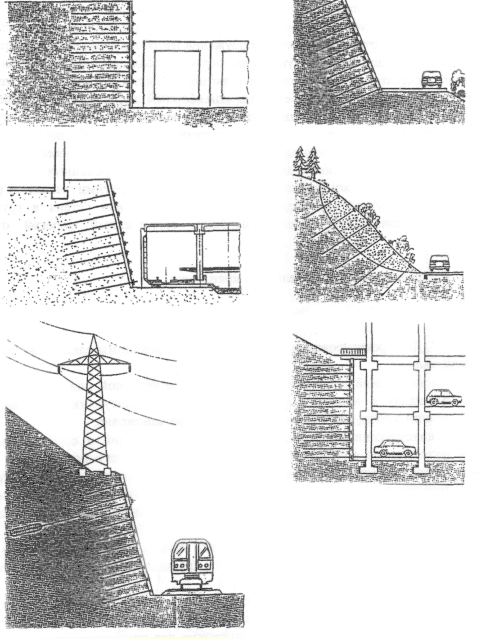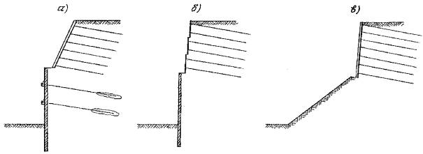 Рис. 3.1. Примеры применения нагельного крепления котлованов и откосов в транспортном строительстве 3.7. Применение нагельного крепления в качестве постоянной конструкции стен транспортных тоннелей и сооружений метрополитена не допускается. 3.8. Временную нагельную крепь следует использовать на период до возведения постоянной конструкции и обратной засыпки котлована. Нагельная крепь с монолитным набрызгбетонным или сборным покрытием, оставленная в грунте после засыпки котлована, может быть использована в качестве шумовиброзащиты на период эксплуатации метрополитена при обосновании того, что нагели не передают вибрацию на близлежащие здания и сооружения. 3.9. В случае глубоких котлованов, а также при переменных грунтовых условиях возможны комбинации нагельной крепи с другими типами ограждающих конструкций: заанкеренная свайная стенка или «стена в грунте» (рис. 3.2а); консольная стенка (рис. 3.2б); естественный пологий откос (рис. 3.2в). 4. Проектирование нагельного крепленияИсходные данные и изыскания4.1. Для проектирования нагельной крепи необходимы следующие исходные данные: · генеральный план участка территории, отведенной под строительную площадку с нанесенными коммуникациями, контурами прилегающих зданий и сооружений, а также отметками их заложения; · конструкции прилегающих коммуникаций зданий и сооружений, их фундаментов, а также нагрузки, передаваемые ими на основание; · отчет по инженерно-геологическим изысканиям по всей трассе строительства, который должен содержать геологические разрезы, отражающие все грунтовые прослойки и напластования, мощности слоев и их наклон, уровень грунтовых вод (с учетом сезонных колебаний); · физико-механические характеристики грунтов, оценка возможного наличия в грунтах крупных включений и скальных пород, степень агрессивности грунтовых вод. 4.2. Инженерно-геологические изыскания следует выполнять в соответствии с требованиями СНиП 1.02.07-87 и Инструкции ВСН 190-78 [1]. 4.3. Инженерно-геологические изыскания для проектирования и устройства крепления должны быть проведены на глубине не менее 1,5Н + 5 м, где Н-глубина котлована или высота откоса. 4.4. При наличии в непосредственной близости от проектируемого крепления зданий и сооружений необходимо обследовать состояние их конструкций и фундаментов для учета и оценки возможных деформаций от раскрытия котлована. В необходимых случаях следует укреплять основания и фундаменты таких сооружений. Характер и объем обследований должен определяться для каждого конкретного объекта строительства. Рис. 3.2. Варианты комбинированных креплений с применением нагелей: а) нагели - заанкеренное ограждение; б) нагели - консольная стенка; в) нагели - естественный откос Состав проекта4.5. Проектирование временной нагельной крепи, котлованов и откосов следует выполнять при разработке раздела «Организация строительства». Когда нагельная крепь используется как постоянная, ее дополнительно следует учитывать на стадии ТЭО и при разработке рабочей документации по проектируемому объекту. 4.6. Проектная документация по устройству нагельной крепи, должна содержать оптимальные конструктивно-технологические решения крепления, выявленные в результате расчета и сравнения технико-экономических показателей вариантов, включая: · пояснительную записку с расчетом и о