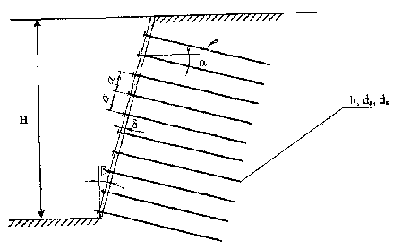 Стадии организации строительства I Разработка грунта с последующей доработкой откоса до проектной крутизны II Погружение в откос нагельных стержней III Навеска и закрепление арматурного каркаса IV Нанесение набрызгбетонного покрытия Рис. 6.3 Схема организации строительства при устройстве нагельного крепления с опережающим погружением стержней в грунт и набрызгбетонным покрытием ¨ механизированная разработка грунта на глубину одного или двух ярусов (0,6 ... 2,0 м) с последующей доработкой откоса до проектной крутизны в соответствии с ППР; ¨ погружение в откос арматурных стержней; ¨ навеска и закрепление стальной сетки или арматурного каркаса; ¨ нанесение набрызгбетонного покрытия; ¨ фиксирование стержней на покрытии. Цикл работ полностью повторяют на следующих захватках и ярусах до достижения проектной глубины. 6.6. Нагельное крепление с набрызгбетонным покрытием при буроинъекционных нагелях допускается применять в качестве как временного, так и постоянного в сухих связных грунтах (суглинки, глины) для котлованов и выемок глубиной до 15 м. Техническая характеристика приведена в табл. 6.2. Таблица 6.2. Техническая характеристика нагельной крепи с набрызгбетонным покрытием. Вариант с буроинъекционными нагелями