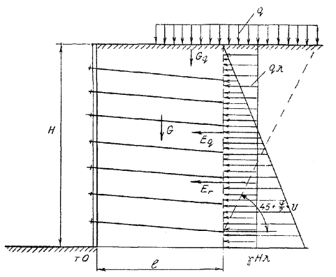 где SМуд - сумма моментов удерживающих сил, воздействующих на армированный массив, относительно центра вращения (т. О); SМопр - сумма моментов опрокидывающих сил относительно того же центра; gn - коэффициент надежности, принимаемый в соответствии с указаниями СНиП 2.02.01-83* в зависимости от класса сооружения и расчетной сейсмичности площадки строительства; gс - коэффициент условий работ (gс = 0,9); G - общий вес армированного массива; j - угол внутреннего трения грунта, лежащего в основании армируемого массива; Е - равнодействующая внешних сдвигающих нагрузок. 4.19. В случае, когда нагельная подпорная стенка расположена на косогорах, в основании имеются слабые или круто падающие пласты грунта, следует провести расчет общей устойчивости закрепленного массива вместе с окружающим грунтом по круглоцилиндрическим поверхностям скольжения. Рис. 4.2. Схема к расчету устойчивости нагельного крепления 4.20. Характеристики набрызгбетонного защитного покрытия стенки (откоса) следует определять прочностным расчетом в соответствии с указаниями ВСН 126-90 [6]. 4.21. Расчеты надлежит выполнять исходя из глубины котлована (высоты откоса), инженерно-геологических условий, физико-механических характеристик грунтов и при максимально невыгодном сочетании внешних нагрузок. 4.22. В случаях, когда грунты слагающие стенку (откос), пучинистые и возможно их промерзание, или грунты набухающие, при расчетах необходимо учитывать действие сил морозного пучения или набухания в соответствии с указаниями СНиП 2.02.01-83*. 4.23. Для получения оптимальной конструкции крепления расчеты рекомендуется вести с применением персональных компьютеров по специально разработанным программам типа «КРЕПЬ» (разработчик НИЦ «Тоннели и метрополитены» ОАО ЦНИИС), «АРМОГРУНТ» (разработчик Санкт-Петербургский университет путей сообщения). Пример расчета по программе «КРЕПЬ» приведен в приложении А. 5. Конструкция и технология устройства грунтовых нагелейПогружные и буроинъекционные нагели5.1. Для крепления грунтовых стен (откосов) в качестве нагелей следует применять систему арматурных стержней, устанавливаемых по мере разработки котлована (выемки) и предназначенных для повышения сопротивления грунта на растяжение и сдвиг путем взаимодействия с массивом по всей своей длине. Используются, как правило, рифленые арматурные стержни класса A-II - A-V диаметром 12 ... 28 мм периодического или винтового профиля по ТУ 14-2-686-86* [2]. Стержневая арматура должна соответствовать требованиям СНиП 2.03.01-84, ГОСТ 5781, ГОСТ 10884. Арматура винтового профиля используется в комплекте с соединительными элементами по ТУ 14-283-19-86 [3] в соответствии с Рекомендациями по применения арматурной стали винтового профиля [4]. Данные по некоторым арматурным нагельным стержням приведены в приложении Б. 5.2. В зависимости от типа грунта и применяемого оборудования (приложение В) арматурные стержни могут быть погружены непосредственно в целик грунта забивкой, задавливанием или завинчиванием, а также установлены в предварительно пробуренных скважинах диаметром 60 ... 120 мм с закреплением цементным раствором (буроинъекционные нагели). 5.3. Погружение стержней допускается в глинистых грунтах твердой или полутвердой консистенции при глубине котлована (откоса), как правило, до 7 ... 8 м, с шагом по вертикали и горизонтали по расчету, но не более 1 м. Ра