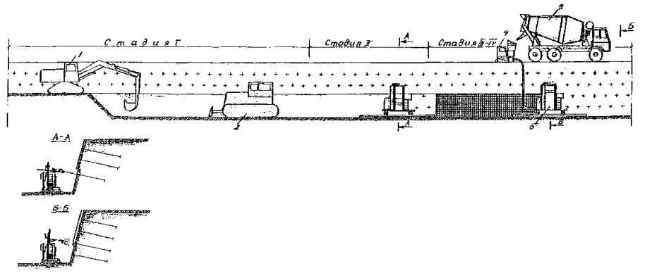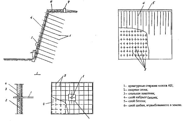 6.5. В состав работ по креплению стен котлованов и откосов при опережающем погружении арматурных стержней в грунт по длине захватки и набрызгбетонном защитном покрытии входят следующие операции (рис. 6.3.): Перечень основного оборудования