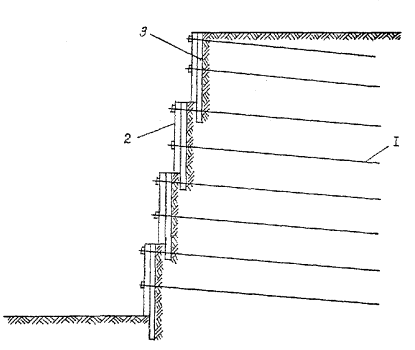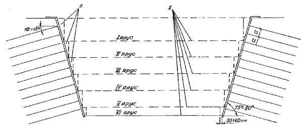 6.7. В состав работ по креплению стен котлованов и откосов при набрызгбетонном покрытии и буроинъекционных нагелях должны входить следующие технологические операции (рис. 6.4): · механизированная разработка грунта на глубину одного или двух ярусов (1,0 ... 3,0 м) по длине захватки, с последующей доработкой откоса до проектной крутизны в соответствии с ППР; · установка арматурной сетки (армокаркаса) и последующее набрызгбетонирование подготовленного участка грунтового откоса; · проходка горизонтальных или наклонных (под углом 0 ... 30°) скважин; · погружение арматурных стержней в скважины; · заполнение скважин цементным раствором с В/Ц 0,4 ... 0,6 (без давления) через инъекционную трубку (обсадную трубу) с одновременным ее извлечением; · фиксирование стержней на поверхности набрызгбетонного покрытия; Рис. 6.4. Технология устройства нагельного крепления с набрызгбетонным экраном и буроинъекционным нагелем Рис 6.5. Схема поярусной разработки грунта. Вариант с погружением стержней непосредственно в грунт. Шаг нагелей a £ 1 м: 1 - поярусная механизированная разработка грунта; 2 - доработка грунта у стен вручную с достижением проектной крутизны откоса · при необходимости нанесение 2-го слоя набрызгбетона; · разработка грунта последующего яруса и повторение операций. 6.8. Поярусную механизированную разработку грунта (рис. 6.5) в зависимости от глубины вскрываемого уступа следует вести в соответствии с ППР, например, бульдозером или экскаватором с планированием дна, перемещением грунта и погрузкой в автосамосвалы. Непосредственно у стен грунт разрабатывают вручную. Зачистку и планировку откоса до проектной крутизны следует вести под геодезическим контролем. 6.9. Промежуток времени между зачисткой откоса и нанесением набрызгбетона должен быть сокращен до минимально возможного (8 ... 24 ч). Работы по выемке грунта, покрытию откоса и установке нагелей надлежит вести в единой технологической цепочке параллельно. Не допускаются перерывы в набрызгбетонировании вскрытого участка. Разработка следующего яруса производится только после закрепления (возведения защитного покрытия устройства нагеля и фиксирование его на поверхности) предыдущего яруса. 6.10. Закрепление стержней на покрытии выполняют навинчиванием фиксирующих гаек или приваркой поперечных отрезков арматуры через закладную пластину (см. рис. 6.1). Закрепление ведут после набора омоноличивающим цементным раствором прочности не менее 1,5 МПа (ориентировочно через 12 ч). 6.11. Поверхность откоса или вертикальной стенки котлована перед нанесением набрызгбетона подготавливают следующим образом: · стенка котлована планируется в соответствии с ППР и выравнивается; · арматурные сетки или каркасы по проекту устанавливаются в один или несколько слоев и притягиваются к грунту забивными крюками. 6.12. Арматурный каркас защитного покрытия допускается выполнять из двух слоев дорожной сетки, установленной со сдвигом по вертикали и горизонтали. 6.13. Арматурный каркас последующих ярусов должен соединяться с выпусками армокаркаса предыдущего яруса сваркой или вязальной проволокой. 6.14. В арматурном каркасе в местах установки нагелей должны устанавливаться деревянные бобышки диаметром соответствующим диаметру скважины (Æ100 ... 120 мм), или отрезки асбоцементных труб (Æ120 ... 150 мм). Отверстия труб должны быть закры