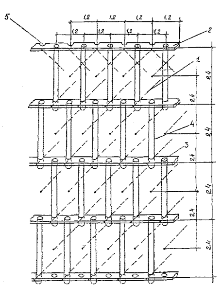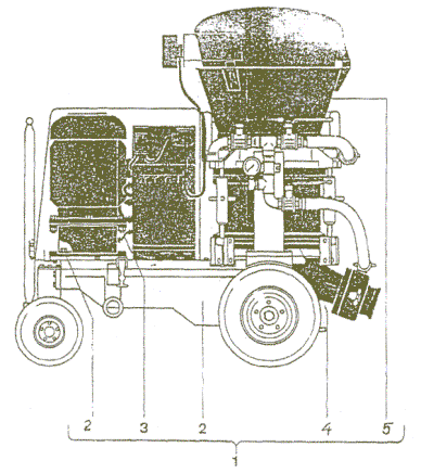 Рис. В.4. Общий вид бетоншприцмашины типа «Алива»: 1 - бетоншприцмашина в сборе; 2 - редуктор; 3 - электродвигатель; 4 - ротор-дозатор; 5 - бункер с вибратором В.8. Кроме перечисленного специализированного оборудования, необходимо применять различные типы общестроительного оборудования и механизмов. В табл. В.7 - В.9 приведена ориентировочная потребность в основных машинах и оборудовании для возведения различных типов нагельного крепления. Таблица В.7. Ориентировочная потребность в машинах и оборудовании для возведения крепи с набрызгбетонным покрытием