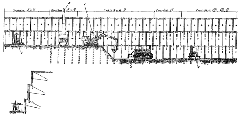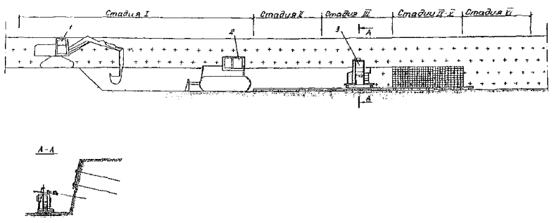 Стадии организации строительства Первый ярус I Установка верхней горизонтальной балки II Прикрепление балки к грунту нагелями III Бурение скважин под сваи IV Устройство свай первого ряда V Разработка грунта первого яруса VI Зачистка стен котлована и установка ж.-б. плит VII Установка нагелей через ж.-б. плиты VIII Установка нижней балки первого яруса IX Прикрепление нижней балки к грунту нагелями Для последующих ярусов повторяют стадии III - IX Рис. 6.9. Схема организации строительства при устройстве нагельного крепления со сборно-разборным экраном Перечень механизмов и оборудования