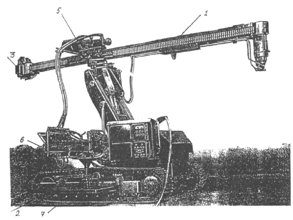 Рис. В.1. Универсальный буровой станок: 1 - лафет; 2 - шасси; 3 - стрела; 4 - клещевой захват; 5 - гидроударник; 6 - пульт управления; 7 - подножка оператора