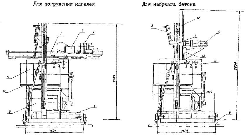 Оборудование позволяет погружать нагельный элемент способом завинчивания, вибрационного воздействия, забивки. Рис. В.3. Универсальная установка для механизированного возведения нагельного крепления со сменным оборудованием: 1 - базовая тележка; 2 - рабочий орган для погружения нагельных элементов; 3 - оборудование для набрызга бетона; 4 - рельсовый путь; 5 - сопло; 6 - вибратор; 7 - вращатель; 8 - гидроцилиндр; 9 - электрошкаф; 10 - рабочая площадка; 11 - гидроблок; 12 - вертикальная направляющая; 13 - горизонтальная направляющая Таблица В.5. Технические характеристики набрызгбетонмашины
