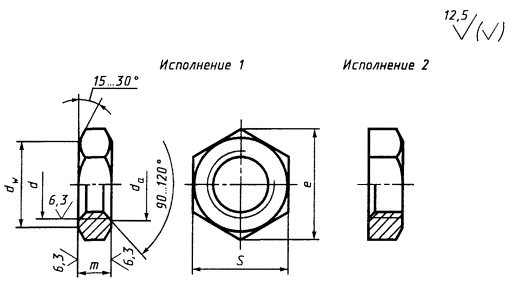 Дата введения 01.01.72 1. Настоящий стандарт распространяется на шестигранные низкие гайки с уменьшенным размером «под ключ» класса точности В с диаметром резьбы от 8 до 48 мм. (Измененная редакция, Изм. № 4). 2. Конструкция и размеры гаек должны соответствовать указанным на чертеже и в таблице. (Измененная редакция, Изм. № 2-7). (Измененная редакция, Изм. № 2, 4). 3а. Не установленные настоящим стандартом допуски размеров, отклонений формы и расположения поверхностей и методы контроля - по ГОСТ 1759.1. 3б. Допустимые дефекты поверхности гаек и методы контроля - по ГОСТ 1759.3. 3а, 3б. (Введены дополнительно, Изм. № 5). 4. (Исключен, Изм. № 5). 5. Технические требования - по ГОСТ 1759.0. 6. (Исключен, Изм. № 2). 7. Масса гаек указана в приложении 1. 8. (Исключен, Изм. № 4). мм