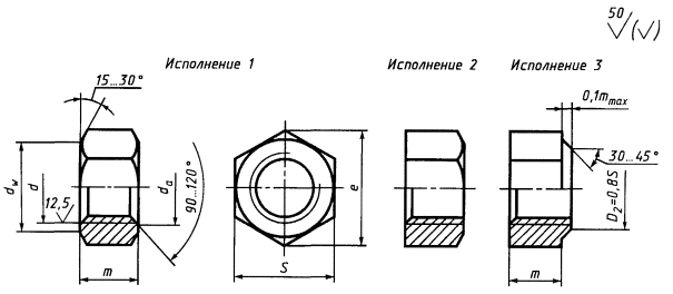Дата введения 01.01.72 1. Настоящий стандарт распространяется на шестигранные гайки класса точности С с диаметром резьбы от 3 до 48 мм. Стандарт полностью соответствует СТ СЭВ 3684-82. (Измененная редакция, Изм. № 4, 6). 2. Конструкция и размеры гаек должны соответствовать указанным на чертеже и в таблице. (Измененная редакция, Изм. № 2-7). (Измененная редакция, Изм. № 4). 3а. Не установленные настоящим стандартом допуски размеров, отклонений формы и расположения поверхностей и методы контроля - по ГОСТ 1759.1. мм