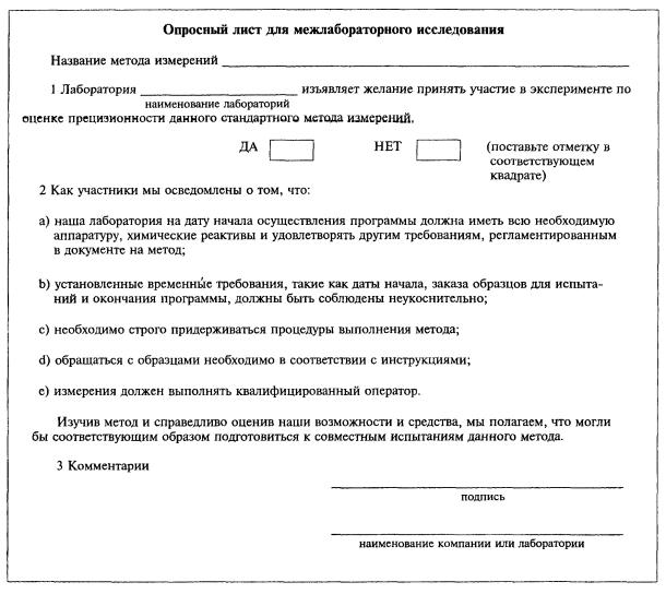 Part 2. Дата введения 2002-11-01 1 Область применения1.1 Настоящий стандарт: - описывает общие принципы планирования совместных межлабораторных экспериментов, предназначенных для количественной оценки прецизионности методов измерений; - детально описывает основной алгоритм количественной оценки прецизионности методов измерений в повседневной практике; - является руководством для персонала, имеющего отношение к планированию эксперимента, осуществлению и анализу результатов измерений по оценке прецизионности. Примечание 1 - Модификации данного основного метода, предусмотренные для конкретных целей, представлены в других частях ГОСТ Р ИСО 5725. В приложении В приведены практические примеры экспериментальной оценки прецизионности методов измерений. 1.3 Предполагают, что при планировании и осуществлении эксперимента по оценке прецизионности соблюдены все принципы, установленные ГОСТ Р ИСО 5725-1. Основной метод предусматривает получение и использование одного и того же количества результатов измерений в каждой лаборатории при анализе проб (образцов), соответствующих одним и тем же уровням измеряемой характеристики (испытуемого параметра); т.е. имеется в виду сбалансированный эксперимент с однородными уровнями. Основной метод применяют к процедурам, которые были стандартизованы и регулярно используются во многих лабораториях. Примечание 2 - Приводятся рабочие примеры для демонстрации сбалансированных однородных серий результатов измерений, даже несмотря на то, что в одном примере было обработано разное количество параллельных определений из расчета на базовый элемент (несбалансированность), а в другом некоторые данные были упущены. Это имеет место в случае, если эксперимент, запланированный как сбалансированный, может оказаться на самом деле несбалансированным, в частности, поскольку при анализе данных выявляются также квазивыбросы и выбросы. 1.4 В качестве подходящего основания для интерпретации и анализа результатов измерений, распределение которых считают приблизительно нормальным, принимают статистическую модель, приведенную в разделе 5 ГОСТ Р ИСО 5725-1. 1.5 Основной метод, описываемый в настоящем стандарте, предназначен для оценки прецизионности метода измерений: a) когда требуется найти стандартные отклонения повторяемости и воспроизводимости, определение которых дано в ГОСТ Р ИСО 5725-1; b) когда предполагаемые к использованию материалы являются однородными либо когда влияние неоднородности может быть учтено в значениях прецизионности; c) когда приемлемо использование схемы проведения эксперимента, основанной на сбалансированных однородных уровнях. 1.6 Такой же подход может быть использован для предварительной оценки прецизионности методов измерений, которые не стандартизованы или не используются повседневно. 2 Нормативные ссылкиВ настоящем стандарте использованы ссылки на следующие стандарты: ГОСТ Р ИСО 5725-1-2002 Точность (правильность и прецизионность) методов и результатов измерений. Часть 1. Основные положения и определения ГОСТ Р ИСО 5725-3-2002 Точность (правильность и прецизионность) методов и результатов измерений. Часть 3. Промежуточные показатели прецизионности стандартного метода измерений ГОСТ Р ИСО 5725-4-2002 Точность (правильность и прецизионность) методов и результатов измерений. Часть 4. Основные метод
