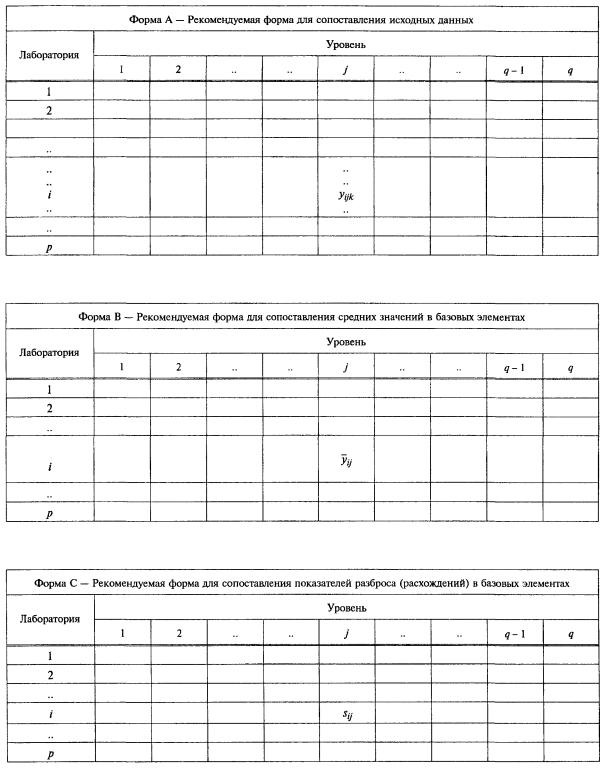 и р = рj. Сначала к средним значениям базовых элементов уровня j применяют критерий Граббса для одного выброса, как описано в 7.3.4.1. Если обнаруживается, что среднее значение базового элемента является выбросом, необходимо исключить его и повторить проверку для другого экстремального среднего значения базового элемента (например, если наивысшее значение является выбросом, то тогда следует проверить наинизшее значение, а наивысшее значение при этом исключить), однако при этом не следует применять критерий Граббса для двух выбросов, описанный в 7.3.4.2. Этот последний критерий нужно применить в случае, если при проверке с использованием критерия Граббса для одного выброса обнаруживается, что средние значения базовых элементов не имеют выбросов. b) Анализ исходных данных в пределах базового элемента, для которого в результате проверки с использованием критерия Кохрена обнаруживается сомнительность значения стандартного отклонения. 7.4 Расчет общего среднего значения и дисперсий7.4.1 Метод анализа Метод анализа, принятый в настоящем стандарте, включает в себя нахождение оценки общего среднего т и прецизионности для каждого уровня отдельно. Результаты расчета представляют в виде таблицы для каждого значения j. 7.4.2 Исходные данные Исходные данные, необходимые для расчетов, должны быть представлены в трех таблицах (рисунок 2), соответствующих формам: - таблице А, содержащей результаты измерений; - таблице В, содержащей средние значения в базовых элементах; - таблице С, содержащей показатели разброса (расхождений) в базовых элементах. 7.4.3 Непустые базовые элементы Следствием правила, сформулированного в 7.3.2.1d, является то, что количество непустых базовых элементов для каждого уровня, используемых при расчете, в таблицах В и С всегда будет одинаковым. Исключение мог бы составить случай, когда, вследствие недостающих данных, базовый элемент в таблице А содержит лишь один результат измерений, что повлечет за собой появление незаполненного базового элемента в таблице С, но не в таблице В. В данном случае можно: a) отбросить единичный результат измерений, после чего появятся незаполненные базовые элементы в таблицах В и С, или b) если потерю информации рассматривают как нежелательную, вносят прочерк в форму С. Количество непустых базовых элементов может быть разным для различных уровней, поэтому и введен индекс j в pj. 7.4.4 Расчет общего среднего значения Для уровня j общее среднее значение равно