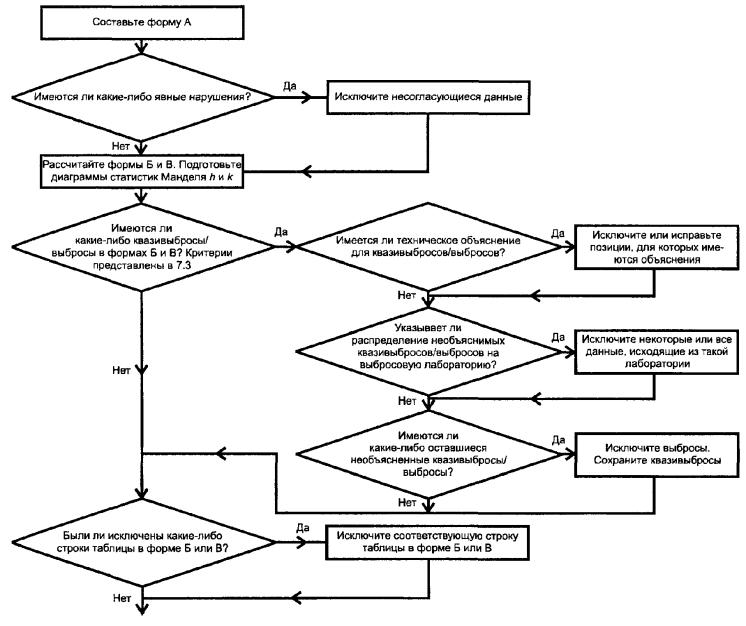 7.6 Статистический анализ как поэтапная процедураПримечание 5 - На рисунке 3 представлена излагаемая в настоящем подразделе процедура статистического анализа. 7.6.1 Все имеющиеся результаты измерений сводят в одну форму А, представленную на рисунке 2 (см. 7.2). Рекомендуется составить данную форму таким образом, чтобы она имела р строк с индексами i = 1, 2, ..., р (представляющих р лабораторий, которые сообщили данные) и q столбцов с индексами j = 1, 2, ..., q (представляющих q уровней в возрастающей последовательности). В эксперименте с однородными уровнями нет необходимости различать результаты измерений в пределах базового элемента формы А, и они могут заноситься в любом порядке. 7.6.2 Проверяют форму А на предмет каких-либо очевидных нарушений, изучают их и, в случае необходимости, исключают явно ошибочные данные (например, выходящие за пределы диапазона средства измерений или невозможные по техническим соображениям) и докладывают о результатах проверки совету экспертов. Иногда сразу же видно, что результаты измерений в отдельной лаборатории либо в отдельном базовом элементе располагаются на уровне, не совместимом с другими данными. Такого рода явно не согласующиеся результаты должны быть незамедлительно исключены, однако об этом необходимо сообщить совету экспертов с целью дальнейшего рассмотрения (см. 7.7.1). 7.6.3 На основании формы А, скорректированной в необходимых случаях согласно 7.6.2, рассчитывают средние значения для базовых элементов и показатели разброса данных в базовых элементах и заполняют соответственно формы В и С. Если базовый элемент в форме А содержит только один результат измерений, необходимо принять одно из решений по 7.4.3. 7.6.4 Готовят диаграммы для статистик Манделя h и k, описанные в 7.3.1, и изучают их на предмет совместимости данных. Эти диаграммы могут отображать пригодность данных для дальнейшего анализа, наличие каких-либо возможных выбросовых значений или выпадающих лабораторий. Тем не менее никакие определенные решения на данной стадии не принимают до завершения работ по 7.6.5-7.6.9. 7.6.5 Проверяют формы В и С (см. рисунок 2) уровень за уровнем на предмет возможных квазивыбросов и/или статистических выбросов (см. 7.3.2.1а). При этом следует применить статистические критерии, приведенные в 7.3, ко всем сомнительным позициям, отмечая квазивыбросы одной звездочкой, а статистические выбросы - двумя. Если же никаких квазивыбросов или статистических выбросов нет, пропускают этапы 7.6.6-7.6.10 и приступают прямо к этапу 7.6.11. 7.6.6 Анализируют вопрос, имеется ли или может ли существовать какое-то техническое объяснение квазивыбросов и/или статистических выбросов и, по возможности, проверяют такое объяснение. В зависимости от результатов корректируют или исключают те квазивыбросы и/или статистические выбросы, которые были удовлетворительно объяснены, и вносят в формы соответствующие исправления. Если после этого никаких квазивыбросов или статистических выбросов не останется, пропускают этапы 7.6.7-7.6.10 и приступают прямо к этапу 7.6.11. Примечание 6 - Большое количество квазивыбросов и/или статистических выбросов может свидетельствовать о резко выраженных расхождениях дисперсий в базовых элементах или резко выраженных различиях между лабораториями, и в связи с этим может возникнуть сомнение в пригодности метода измерений. Об этом необход