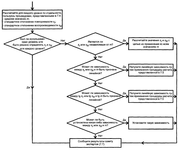 Рисунок 3 (продолжение) 7.6.13 Строят график функции sj, по аргументу 7.6.14 Используют выражение 7.6.15 Исходя из графика, упомянутого в 7.6.13, делают вывод, может ли зависимость между s и т быть выражена прямой линией, и если да, то является ли подходящей зависимость I (s = bm) или II (s = а + bm) (см. 7.5.2). Определяют параметр b или два параметра а и b, пользуясь процедурой, изложенной в 7.5.6. Если линейную зависимость признают удовлетворительной, пропускают этап 7.6.16 и приступают непосредственно к этапу 7.6.17. Если же нет, то приступают к этапу 7.6.16. 7.6.16 Строят график функции lg sj по аргументу 7.6.17 Если на этапе 7.6.15 или 7.6.16 было установлено удовлетворительное соотношение, то окончательными значениями sr (или sr) считают сглаженные значения, полученные из данной зависимости для заданных значений т. Пренебрегая этапом 7.6.18, приступают к этапу 7.6.19. 7.6.18 Если на этапе 7.6.15 или 7.6.16 не было установлено никакого удовлетворительного соотношения, то эксперт по статистике должен решить, может ли быть установлено какое-либо другое соотношение между s и т, или, в качестве альтернативы, настолько ли нерегулярны данные, что установление функциональной зависимости представляется невозможным. 7.6.19 Готовят доклад, демонстрирующий основные данные и результаты, а также выводы из статистического анализа, и представляют его совету экспертов. Для иллюстрации совместимости или изменчивости результатов может оказаться полезным графическое представление по 7.3.1. 7.7 Доклад совету экспертов и принимаемые им решения7.7.1 Доклад эксперта по статистике Завершив статистический анализ, эксперт по статистике должен представить на рассмотрение совету экспертов доклад. В докладе должна быть следующая информация: a) полный перечень наблюдений, полученных от операторов и/или инспекторов, знающих стандарт на метод измерений; b) полный перечень лабораторий, которые были исключены как выпадающие на этапах 7.6.2 и 7.6.8, и основания для их исключения; c) полный перечень обнаруженных квазивыбросов и/или статистических выбросов с пояснениями, были ли они объяснены и исправлены или исключены; d) форма с окончательными результатами