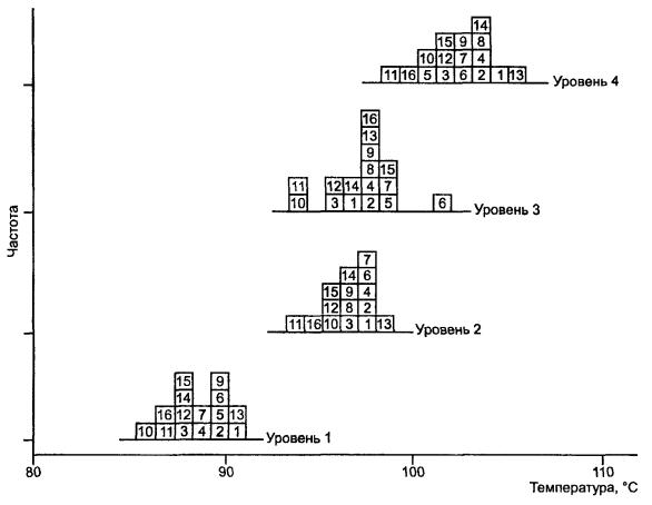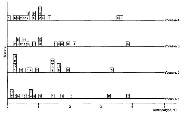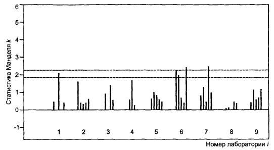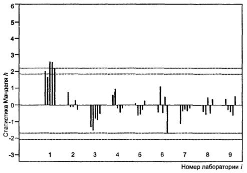 для каждой лаборатории в пределах каждого уровня. Наконец значения kij для каждого базового элемента наносят на диаграмму в последовательности увеличения индекса i, так чтобы каждому номеру лаборатории соответствовала группа значений kij, относящихся к разным уровням (см. рисунок В.8). 7.3.1.3 Изучая диаграммы для h и k, можно отметить, что наглядные представления результатов для отдельных лабораторий заметно отличаются от других. Это выражается в последовательно высокой или низкой внутриэлементной вариации и/или в последовательно высоких или низких средних значениях для базовых элементов по многим уровням. С такими лабораториями нужно установить контакт, чтобы постараться выяснить причину расхождений. На основании полученных сведений эксперт по статистике может: a) сохранить на данный момент результаты лаборатории; b) попросить лабораторию выполнить измерение заново (если это возможно); c) исключить данные лаборатории из анализа. 7.3.1.4 В диаграммах для h можно увидеть различные проявления. В одном случае все лаборатории могут иметь как положительные, так и отрицательные значения h на различных уровнях эксперимента. В другом случае отдельные лаборатории могут иметь тенденцию к представлению либо только положительных, либо только отрицательных значений h, и количество лабораторий, дающих отрицательные значения, приблизительно равно количеству лабораторий, дающих положительные значения. Ни одно из этих проявлений не является необычным или требующим изучения, хотя во втором случае может возникнуть мысль о существовании в лаборатории некоего общего источника систематической погрешности. Однако если все значения h для одной лаборатории имеют один знак, а для прочих лабораторий - другой, то в этом случае необходимо попытаться найти причину. Также нужно искать причины расхождений, если значения h для лаборатории, во-первых, являются сравнительно большими и, во-вторых, неким систематическим образом зависят от уровня эксперимента. На диаграммах для h проводят линии, соответствующие индикаторам, представленным в 8.3 (таблицы 6 и 7). Эти индикаторные линии служат ориентирами при анализе диаграмм. 7.3.1.5 Если одна из лабораторий выделяется по статистике k, имея при этом много больших значений, то должна быть установлена причина этого, указывающая на худшую повторяемость по сравнению с другими лабораториями. Например, лаборатория могла бы иметь последовательно меньшие значения k, если бы не влияли такие факторы, как завышение при округлении своих данных или недостаточная чувствительность в диапазоне измерений. На диаграммах для k также проводятся линии в соответствии с индикаторами, представленными в 8.3 (таблицы 6 и 7), служащие ориентирами при анализе диаграмм. 7.3.1.6 Когда из части диаграммы для h или k, относящейся к некоей лаборатории, видно, что некоторые значения близки к критическим, т.е. соответствующим индикаторным линиям, нужно рассмотреть всю диаграмму для уровня. Нередко значение, представляющееся большим в части диаграммы, относящейся к лаборатории, оказывается в разумных пределах совместимым со значениями для других лабораторий на том же уровне. Однако если обнаруживается, что оно сильно отличается от значений для других лабораторий, то необходимо попытаться выяснить причину. 7.3.1.7 В дополнение к диаграммам h и k гистограммы ср