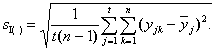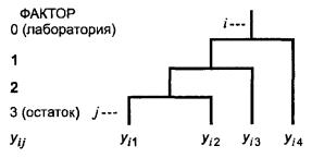 λ Поддающаяся обнаружению разность между систематическими погрешностями двух лабораторий при реализации одного и того же метода измерений или систематическими погрешностями двух методов измерений (МВИ) одного и того же назначения на идентичных образцах μ Истинное или принятое опорное значение измеряемой величины (характеристики) ν Число степеней свободы ρ Поддающееся обнаружению соотношение между стандартными отклонениями повторяемости (сходимости) для методов В и А σ Истинное (действительное) значение стандартного отклонения τ Составляющая результата измерений, представляющая изменение, обусловленное временем, прошедшим с момента последней калибровки φ Поддающееся обнаружению соотношение между квадратными корнями из межлабораторных средних квадратов для методов В и А σ2M p-квантиль χ2-распределения с ν степенями свободы Символы, используемые в качестве подстрочных индексов C Различие, определяемое калибровкой E Различие, определяемое оборудованием i Идентификатор для конкретной лаборатории I( ) Идентификатор для промежуточных мер прецизионности; в скобках - идентификация типа промежуточной ситуации j Идентификатор для уровня (ГОСТ Р ИСО 5725-2) Идентификатор для группы испытаний или для фактора (ГОСТ Р ИСО 5725-3) k Идентификатор для конкретного результата испытаний в лаборатории i на уровне j L Межлабораторный m Идентификатор для поддающейся обнаружению систематической погрешности M Различие, обусловленное неидентичностью проб (образцов) O Различие, определяемое сменой оператора P Вероятность r Повторяемость R Воспроизводимость T Различие, обусловленное периодом (временем), в течение которого проводят измерения или оценочный эксперимент W Внутрилабораторный 1, 2, 3, … Для результатов измерений, нумеруемых в порядке их получения (1), (2), (3), … Для результатов измерений (или результатов испытаний), нумеруемых в порядке возрастания измеряемой величины ПРИЛОЖЕНИЕ B(обязательное) Анализ дисперсии для полностью вложенных экспериментовАнализ дисперсии, описываемый в настоящем приложении, должен проводиться по отдельности для каждого уровня испытаний, предусмотренного в межлабораторном эксперименте. Для упрощения у данных опущен подстрочный индекс, указывающий на уровень испытаний. Отметим, что в настоящем стандарте подстрочный индексу используют для обозначения фактора 1 (фактор 0 означает лабораторию), в то время как в других частях ГОСТ Р ИСО 5725 его используют для обозначения уровня испытаний. Для проверки данных на совместимость и наличие выбросов должны применяться методы, описанные в 7.3 ГОСТ Р ИСО 5725-2. Для экспериментов, описываемых в настоящем приложении, точный анализ данных очень сложен в случаях, когда опускаются отдельные результаты измерений, получаемые от лаборатории. Поэтому если принимают решение о том, что некоторые результаты являются квазивыбросами или выбросами и должны быть исключены из анализа, то рекомендуется исключить также все другие данные, полученные лабораторией на уровнях, где имеются исключаемые квазивыбросы и выбросы. В.1 Трехфакторный полностью вложенный экспериментДанные, полученные в результате эксперимента, обозначают через yijk, а средние значения и диапазоны изменений имеют следующий вид: