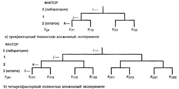 Из средних квадратов MS0, MS1, MS2 и MSe могут быть получены несмещенные оценки s2(0), s2(1), s2(2) и s2r соответствующих величин σ2(0), σ2(1), σ2(2), и σ2r, а именно: s2(0) = 1/8(MS0 - MS1), s2(1) = 1/4(MS1 - MS2), s2(2) = 1/2(MS2 - MSe), s2r = MSe. Оценки дисперсий повторяемости, промежуточной прецизионности с одним изменяющимся фактором, промежуточной прецизионности с двумя изменяющимися факторами и воспроизводимости соответственно равны: s2r, s2I(1) = s2r + s2(2), s2I(2) = s2r + s2(2) + s2(1), s2R = s2r + s2(2) + s2(1) + s2(0). ПРИЛОЖЕНИЕ C(обязательное) Анализ дисперсии для ступенчато вложенных экспериментовАнализ дисперсии, описываемый в настоящем приложении, должен проводиться по отдельности для каждого уровня испытаний, предусмотренного в межлабораторном эксперименте. Для упрощения у данных опущен подстрочный индекс, указывающий на уровень испытаний. Отметим, что в настоящем стандарте подстрочный индекс j используют для обозначения параллельных определений в лаборатории, в то время как в других частях ГОСТ Р ИСО 5725 его используют для обозначения уровня испытаний. Для проверки данных на совместимость и наличие выбросов должны применяться методы, описанные в 7.3 ГОСТ Р ИСО 5725-2. Для экспериментов, описываемых в настоящем приложении, точный анализ данных очень сложен в случаях, когда опускаются отдельные результаты измерений, получаемые от лаборатории. Поэтому если принимают решение о том, что некоторые результаты измерений лаборатории являются квазивыбросами или выбросами и должны быть исключены из анализа, то рекомендуется исключить также все другие данные, полученные этой лабораторией на уровнях, где имеются исключаемые квазивыбросы и выбросы. С.1 Трехфакторный ступенчато вложенный экспериментДанные, полученные в результате эксперимента в пределах лаборатории i, обозначают yij (j = 1, 2, 3), а средние значения и диапазоны изменений имеют следующий вид:
