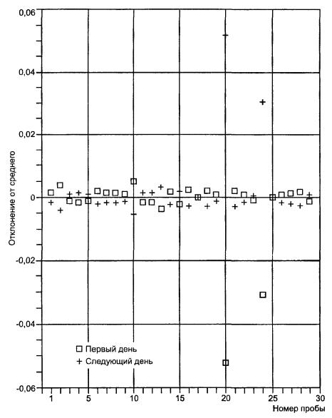 диаграмма отклонений от средних значений, полученных в первый и второй дни