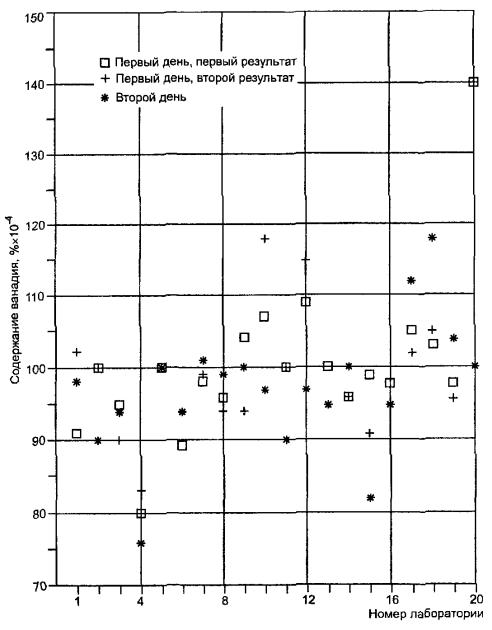 Рисунок D.1 - Содержание углерода в стали. Отклонения от среднего значения результатов измерений, полученных в первый и второй дни, для различных проб D.2 Пример 2. Получение стандартного отклонения промежуточной прецизионности с изменяющимся фактором времени посредством межлабораторного экспериментаD.2.1 Сведения общего характера a) Метод измерений Определение содержания ванадия в стали методом атомно-абсорбционной спектрометрии, описанным в инструкции к эксперименту. Результаты исследования выражают в процентах по массе. b) Источник ИСО/ТК 17 Сталь/ПК 1, Методы определения химического состава. Эксперимент проводился в мае 1985 г. c) Схема эксперимента. Трехфакторный ступенчато вложенный эксперимент осуществлялся с участием 20 лабораторий, каждая из которых представляла два результата измерений в условиях повторяемости в первый день и еще один результат - на следующий день на каждом из шести уровней, предусмотренных в эксперименте. Все измерения в каждой лаборатории выполнялись одним оператором, с использованием одного и того же измерительного оборудования. D.2.2 Анализ Данные для всех шести уровней представлены в таблице D.2. Рисунок D.2 - Содержание ванадия в стали. Результаты измерений, полученные в первый и второй дни на уровне 1 в различных лабораториях Анализ дисперсии дается только для одного из уровней, а именно для уровня 1. Диаграмма данных (результаты измерений, проводимых в первый и второй дни в функции номера лаборатории i) приведена на рисунке D.2. Диаграмма свидетельствует о том, что лаборатория 20 - выпадающая. Имеет место большое расхождение между результатом измерений во второй день и средним значением в первый день по сравнению с результатами измерений в других лабораториях. Данная лаборатория была исключена из расчетов показателей прецизионности. В