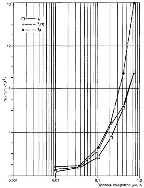 Рисунок D.3 - Содержание ванадия в стали. Стандартные отклонения повторяемости sr промежуточной прецизионности с изменяющимся фактором времени sI(T) и воспроизводимости sR как функции уровня концентрации ПРИЛОЖЕНИЕ E(справочное) Библиография[2] ISO Guide 33:1989. Use of certified reference materials [3] ISO Guide 35:1989. Certification of reference materials - General and statistical principles [4] ISO 3534-3:1985 Statistics-Vocabulary and symbols - Part 3: Design of experiments Ключевые слова: измерение, испытания, метод измерений, стандартизация метода измерений, результаты измерений, результаты испытаний, точность, правильность, прецизионность, систематическая погрешность, повторяемость, воспроизводимость, случайная погрешность, эксперимент по оценке точности, альтернативный метод измерений, статистический анализ