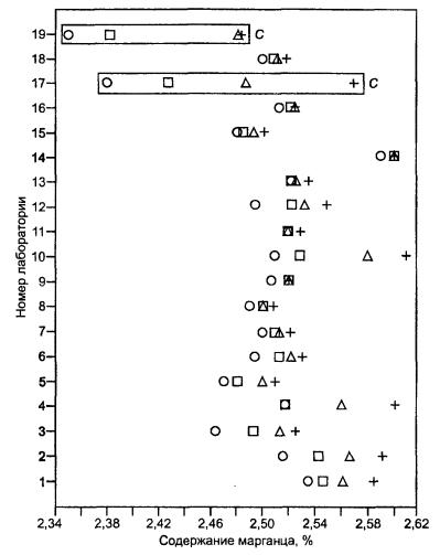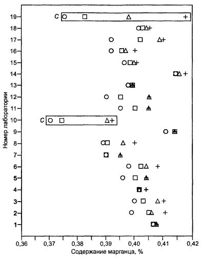 Примечание - Точки в прямоугольных рамках означают, что соответствующие результаты измерений были идентифицированы как выбросы согласно критерию Кохрена (C). Рисунок В.3 - Содержание марганца в железных рудах. Результаты измерений на уровне 3
