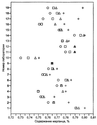 Примечание - Точки в прямоугольных рамках означают, что соответствующие результаты измерений были идентифицированы как выбросы согласно критерию Граббса для двух выбросов (G2). Рисунок В.1 - Содержание марганца в железных рудах. Результаты измерений на уровне 1