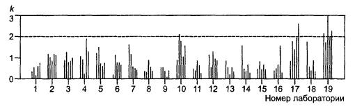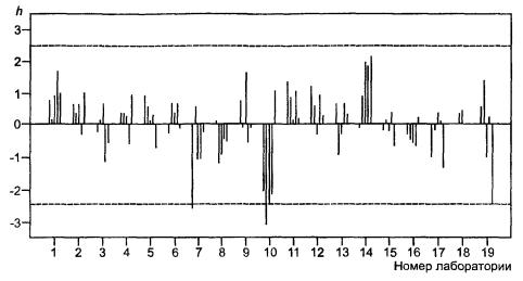 Символы, используемые в качестве подстрочных индексов C Различие, определяемое калибровкой E Различие, определяемое оборудованием i Идентификатор для конкретной лаборатории I() Идентификатор для промежуточных мер прецизионности; в скобках - идентификация типа промежуточной ситуации j Идентификатор для уровня (ГОСТ Р ИСО 5725-2) Идентификатор для группы испытаний или для фактора (ГОСТ Р ИСО 5725-3) k Идентификатор для конкретного результата испытаний в лаборатории i на уровне j L Межлабораторный m Идентификатор для поддающейся обнаружению систематической погрешности M Различие, обусловленное неидентичностью проб (образцов) O Различие, определяемое сменой оператора P Вероятность r Повторяемость R Воспроизводимость T Различие, обусловленное периодом (временем), в течение которого проводят измерения или оценочный эксперимент W Внутрилабораторный 1, 2, 3... Для результатов измерений, нумеруемых в порядке их получения (1), (2), (3)... Для результатов измерений (испытаний), нумеруемых в порядке возрастания измеряемой величины ПРИЛОЖЕНИЕ В(справочное) Пример эксперимента по оценке точностиВ.1 Описание экспериментаЭксперимент по оценке точности определения содержания марганца в железных рудах методом атомной абсорбции проводился Техническим комитетом ИСО/ТК 102 «Железные руды» с использованием пяти исследуемых образцов с принятыми опорными значениями (m), приведенными в таблице В.1 (эти значения лабораториям не сообщались). Каждая лаборатория получила для каждого уровня по две наугад отобранные колбы с исследуемой пробой и провела параллельные анализы из каждой колбы. Две колбы использовались для подтверждения отсутствия различий между ними. Анализы были выполнены таким образом, чтобы в случае отсутствия различий между колбами четыре результата анализа могли быть признаны полученными в условиях повторяемости. Анализ результатов показал, что различие между колбами действительно было несущественным; пробы были признаны гомогенными. Такие результаты от каждой лаборатории могут быть признаны параллельными определениями в условиях повторяемости. Результаты анализов представлены в таблице В.2. Средние значения по лабораториям и дисперсии для каждого из пяти исследуемых образцов представлены в таблице В.3. В.2 Оценка прецизионностиС целью оценки прецизионности химико-аналитического метода данные были подвергнуты анализу согласно процедуре, описанной в ГОСТ Р ИСО 5725-2. Результаты измерений для каждого уровня представлены на рисунках В.1 - В.5. Квазивыбросы и выбросы как для критерия Кохрена, так и для критерия Граббса были идентифицированы и сведены в таблицу В.4. Точки на рисунках В.1 - В.5 в прямоугольных рамках означают, что соответствующие результаты измерений были идентифицированы как выбросы. Таблица В.4 демонстрирует, что в качестве выбросов были идентифицированы семь результатов; среди них пять принадлежали двум лабораториям (№ 10 и № 19). Один результат был идентифицирован как квазивыброс; он принадлежал той же лаборатории (№ 10). Значения статистик h и k представлены на рисунках В.6 и В.7. Значения h (рисунок В.6) отчетливо свидетельствуют, что лаборатория № 10 получает очень низкие результаты; два из них (уровни 2 и 3) были идентифицированы как выбросы. По этой причине было решено полностью исключить результаты лаборатории № 10; это должно бы 