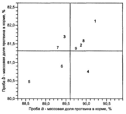 Робастное среднее значение для расхождений в элементах составляет х* = 8,219 + 1,5 ´ 0,354/8 = 8,285 % протеина. При этих значениях х* и s* j = 1,5 ´ 0,354 = 0,531. Тогда x* - j = 7,754 и х* + j = 8,816 % протеина. Это подтверждает, что в расчетах х* и s* только х9* было вне этих пределов. Можно сделать заключение, что это тот самый случай, когда действительно найдено правильное решение. 6.7.3 Применение Алгоритма А к средним значениям в элементах (из таблицы 6) дает результаты, представленные в таблице 28, в которой средние значения в элементах расположены в порядке возрастания. Ситуация подобна представленной в таблице 26, а именно х1* и х9* отличаются более чем на j от х* и х* устремляется к среднему значению от х2* до х8*, равному 85,486. Применяя вновь метод из 6.2.6, но со значениями ul = иU = 1, получим, что среднее значение и стандартное отклонение от х2* до х8* составят: х΄ = 85,486 и s΄ = 0,209. Значит, на основе уравнения (63) может быть получено s* из равенства (s*)2 = 6 ´ (0,209)2/[8/1,1342 - 1,52(9 + 9 - 4)/7], откуда s* = 0,390 % протеина. Теперь можно вычислить х* по формуле (62) в 6.2.6, что дает x* = 85,486 % протеина. Для контроля правильности решения, рассчитывают j = 1,5 ´ 0,390 = 0,585, х* - j = 84,901, х* + j = 86,071 % протеина. Таблица 28 - Пример 5. Применение Алгоритма А к средним значениям в элементах (% протеина)