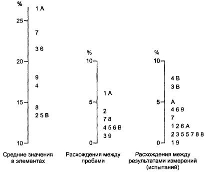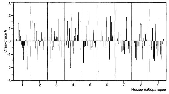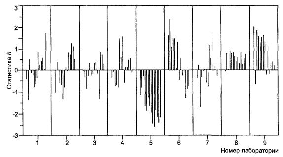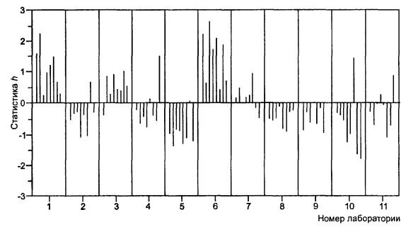 5.8.4 Рисунок 4 представляет гистограммы расхождений между результатами измерений, расхождений между пробами и средних значений в элементах для уровня 6. Графики такого типа позволяют легко определить расхождения, возникающие от различных источников (между результатами измерений, пробами и лабораториями). Рисунок 4 показывает, что в этом эксперименте на уровне 6 имеется широкая вариация в средних значениях по элементам, так что, если метод испытаний будет соответствовать спецификации, то, вероятно, будут возникать разногласия между продавцом и покупателем из-за расхождений в результатах. Расхождения между пробами, которые меньше расхождений между результатами измерений (испытаний), означают, что разница между пробами на уровне 6 не является значительной. А, В - лаборатории № 10 и 11 соответственно. Рисунок 4 - Пример 2. Гистограммы расхождений и средних значений из таблиц 14-16 для уровня 6 5.8.5 Значения статистик h и k, рассчитанные согласно 5.6.1, также представлены в таблицах 14-16 лишь для уровня 6. Для всех уровней эти значения изображены графически на рисунках 5-7; порядок уровней изменен так, чтобы общие средние по уровню располагались в порядке их возрастания, как показано в таблице 17. Рисунок 5 показывает, что лаборатория № 6 получила несколько высоких значений статистики k для расхождений между результатами измерений, что свидетельствует о ее худшей повторяемости по сравнению с остальными лабораториями. Рисунок 6 показывает, что три лаборатории (№ 1, 6 и 10) получили высокие значения статистики k для расхождений между пробами, что могло произойти из-за отклонений от рекомендованной процедуры подготовки испытуемых навесок из проб. Рисунок 7 показывает устойчивые положительные или отрицательные значения статистики h в большинстве лабораторий (в лабораториях № 1, 6 и 10 вновь достигнуты наибольшие значения). Это прямое доказательство того, что в большинстве лабораторий имеется систематическая погрешность, свидетельствующая, что метод измерений (испытаний) неадекватно реализуется. Рисунок 5 - Пример 2. Проверка совместимости расхождений между результатами измерений (сгруппированных по лабораториям) Рисунок 6 - Пример 2. Проверка совместимости расхождений между пробами (сгруппированных по лабораториям) 5.8.6 Применение анализа данных по критериям Кохрена и Граббса, как описано в 5.6.2, дает результаты, представленные в таблице 18. Установлены два выброса. В отсутствие другой информации, данные, ответственные за это, должны быть исключены, а расчеты повторены. Анализ может быть затем продолжен в направлении исследования функциональных связей таким же способом, как в эксперименте по модели с однородными уровнями, рассмотренном в ГОСТ Р ИСО 5725-2. Рисунок 7 - Пример 2. Проверка совместимости средних значений в элементах (сгруппированных по лабораториям) Таблица 18 - Пример 2. Значения статистик Кохрена и Граббса
