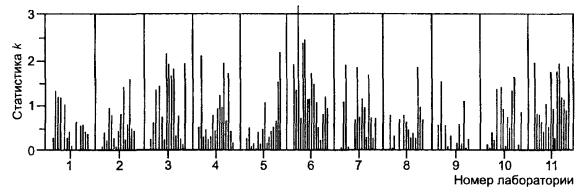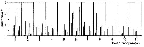 Наносят статистические данные на график, чтобы показать, в каких лабораториях имеет место несовместимость, выстраивают данные по уровням, а также группируют их по лабораториям. Для контроля совместимости расхождений между результатами измерений, рассчитывают статистику k по формуле