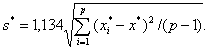При расчете вручную аналитик должен использовать прямой метод, описанный в 6.2.6, например иL = иU = 1. Это дает х′ = 20,412 и s′ = 0,573 % креозота. Отсюда из уравнений (62) и (63) (s*)2 = 6 ´ (0,573)2/[8/1,1342 - 1,52 (9 + 9 - 4)/7] получаем s* = 1,070 % креозота и х* = х′ = 20,412 % креозота. Можно затем подтвердить, что значение s* дает j = 1,605 (тогда как предполагалось, что только x1* и х9* отличаются от х* = 20,412 более чем на j) и что замена x1* на 18,807 и x9* на 22,017 дает новое значение х* = 20,412, а новое значение s* = 0,944 ´ 1,134 = 1,070, так что представленное решение является правильным. Оценку межлабораторного стандартного отклонения проводят по формуле (72):