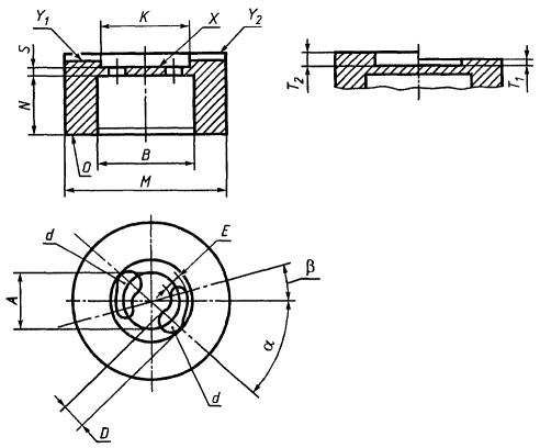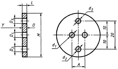 Указаны только контролируемые размеры Рисунок 1 - Размеры стартеров Указаны только основные размеры калибров Назначение. Для проверки размеров Dmin, Dmax, Lmax диаметра штырька и расположения штырьков на рисунке 1. Испытание. Штырьки должны входить в отверстие d1 калибра со стороны поверхности О и при полном вставлении поверхности стартера и калибра должны соприкасаться. В этом положении концы штырьков не должны выступать за поверхность Y. Каждый штырек должен входить в отверстие d2, но не должен входить в отверстие d3. В миллиметрах