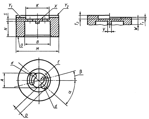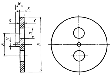 Назначение. Для контроля того, что стартер не может быть вставлен в специальный патрон, снабженный выступом диаметром V. Испытание. Стартер должен входить в калибр со стороны поверхности О, но головки штырьков не должны выступать за поверхность Y. Рисунок 3 - Непроходной калибр для стартеров Указаны только основные размеры калибра Размеры в миллиметрах