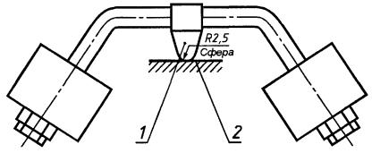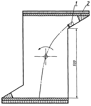 Назначение. Для контроля размеров bmax, Smin, Tmin, Tmax и положения штырьков относительно размеров A, D и Е на рисунке 1. Испытание. Стартер должен входить в калибр со стороны поверхности О до тех пор, пока штырьки не пройдут через отверстия d. Затем стартер поворачивают на ~45° и устанавливают таким образом, чтобы головки штырьков соприкасались с поверхностью X. В этом положении выпуклости головок штырьков не должны быть ниже поверхности Y1 и выступать за поверхность Y2. Рисунок 4 - Проходные калибры для стартеров 7.7 Испытание на скручиваниеСтартер должен быть прочным и выдерживать крутящий момент до 0,6 Н·м, приложенный к верхней части корпуса при закреплении штырьков в неподвижной опоре. Крутящий момент должен прикладываться постепенно с возрастанием от нуля до заданного значения. 7.8 Механическая прочностьСтартер должен выдерживать без повреждения, влияющего на безопасность его применения, 20 падений с высоты 500 мм на стальную пластину толщиной 3 мм в барабане с частотой вращения 5 мин-1 (что составляет 10 падений в минуту). Схема барабана приведена на рисунке 5. 1 - стартер; 2 - стальная пластина Рисунок 5 - Опрокидывающийся барабан 7.9 Электрические соединенияЭлектрические соединения должны быть выполнены таким образом, чтобы контакты не оказывали давление на изоляционный материал (кроме керамического). Соответствие данному требованию проверяют осмотром. Это требование не распространяется на соединения между съемными частями, такими как стартеры и патроны, для которых требуется соответствующее усилие пружины. 7.10 Тепло- и огнестойкость7.10.1 Корпуса и другие внешние части стартера из изоляционного материала должны быть теплостойкими. Соответствие этому требованию проверяют следующими испытаниями. Пять образцов испытывают в камере тепла при температуре 125 °С в течение 168 ч. При испытании стартеры не должны подвергаться каким-либо изменениям, приводящим к нарушению их безопасности, особенно таких как: - уменьшение защиты от поражения электрическим током; - ослабление электрических контактов; - появление трещин, разбухание или сжатие. После испытания размеры стартера должны соответствовать требованиям, указанным в 7.6.1. 7.10.2 Корпус и другие наружные части стартера из изоляционного материала подвергают испытанию вдавливанием шарика при помощи устройства, схема которого приведена на рисунке 6. Поверхность испытуемой детали располагают горизонтально. В поверхность с усилием 20 Н вдавливают шарик диаметром 5 мм. Если испытуемая поверхность прогибается, то та часть детали, в которую вдавливают шарик, должна поддерживаться в том месте. Испытание проводят в камере тепла при температуре (125±5) °С. Через 1 ч шарик снимают и замеряют диаметр вмятины. Диаметр вмятины не должен превышать 2 мм. Примечание - Испытание не проводят на деталях из керамики, карбамида или алкидного пластика. Возможность проведения испытания для корпусов, изготовленных из этих материалов, рассматривается. 1 - стальной шарик; 2 - испытуемая поверхность Рисунок 6 - Устройство для испытания вдавливанием шарика 7.10.3 Корпуса и другие наружные части стартера из изоляционного материала должны быть огне- и теплостойкими. Соответствие проверяют испытанием при помощи никель-хромовой проволоки, раскаленной до 650 °С. Схема испытательного прибора приведена в МЭК 60695-2-1. Испытуемый стартер мон
