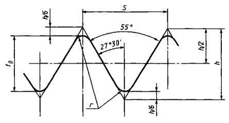 Рисунок 1a - Ниппельная резьба патронов Трубная резьба ИСО Основной профиль* h = 0,960491S, h/6 = 0,160082S, t0 = 2/3h = 0,640327S, r = 0,137329S * За основной принимают профиль, имеющий предельные отклонения наружной резьбы. Предельный профиль гайки