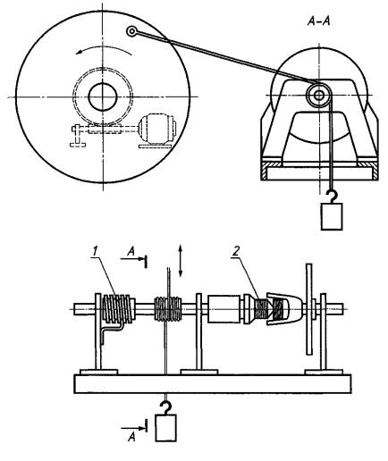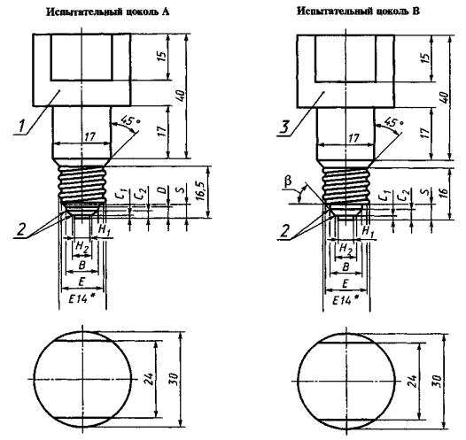 Рисунок 3 - Калибр для крепежных отверстий фланцевых резьбовых патронов 1 - направляющее устройство; 2 - испытательный цоколь Рисунок 4 - Установка для проверки нормальной работоспособности Материал: закаленная сталь. Примечание - Размеры резьбы на испытательном цоколе должны быть между максимальными и минимальными значениями, указанными для цоколей Е14, Е27 и Е40 в стандартных листах 7004-23, 7004-21 и 7004-24 МЭК 60061-1 соответственно. Размеры в миллиметрах