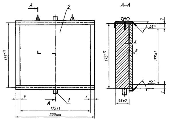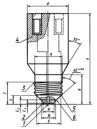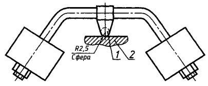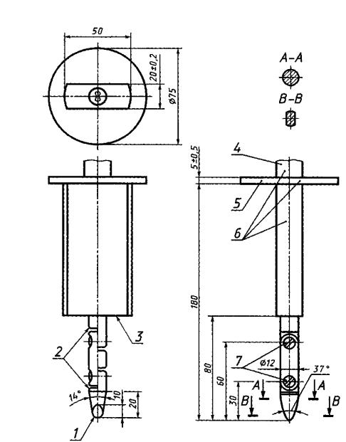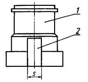 1 - ось; 2 - лист фанеры Примечание - Подробная информация приведена в базовом стандарте. В случае двойного толкования рисунка следует обращаться к МЭК 60068-2-75. Рисунок 8а - Монтажная подставка Радиус сферы сжимающих частей 20 мм 1 - регулятор высоты; 2 - передвижной груз; 3 - сфера Рисунок 9 - Установка для испытания на сжатие 1 - стальной шарик; 2 - образец Рисунок 10 - Устройство для проверки вдавливанием шарика 1 - стальная пластина; 2 - изоляционный материал*; 3 - скругление***; 4 - металл; 5 - латунный цоколь; 6 - фаска или скругление Допуски: - для размеров: до 30 мм включ........ ±0,05 св. 30 мм ...........…... ±0,1 для углов ..........….... ±30' * Изоляционный материал должен обеспечивать стабильные размеры, легко формоваться и иметь PTI = 600, например PTFE - стабилизированный материал. ** Относится только к металлическим деталям; не применяется к испытательному цоколю Е10. Размеры резьбы на испытательном цоколе должны быть между максимальными и минимальными значениями, указанными в стандартных листах 7004-22, 7004-23, 7004-21 и 7004-24 МЭК 60061-1 соответственно для цоколей Е10, Е14, Е27 и Е40. Внутренний диаметр латунного цоколя должен быть на 2 мм меньше размера d1, указанного в соответствующем стандартном листе. Сечение проводов должно быть: 0,75; 1,5; 2,5 и 4,0 мм2 для цоколей Е10, Е14, Е27 и Е40 соответственно. Провода должны быть жесткие (одно- или многопроволочные). *** Для испытательного цоколя Е14 требуется фаска 45° на цилиндрической части. Примечание - Значения для патронов Е5 в стадии разработки В миллиметрах