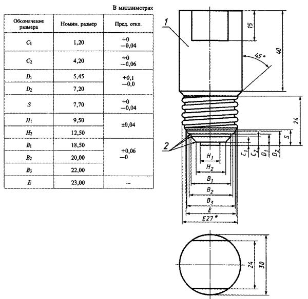 Заземляющий контактный зажим должен быть обозначен символом Этот символ не должен наноситься на винты, съемные шайбы или легкосъемные детали. Проверку проводят внешним осмотром. 7.5 Маркировка должна быть прочной и легкочитаемой. Проверку проводят внешним осмотром и после испытания по разделу 19 легкими натираниями места нанесения маркировки в течение 15 с куском ткани, смоченным водой, а затем в течение 15 с - куском ткани, смоченным бензином. После испытания маркировка должна быть по-прежнему читаема. Примечание - В качестве растворителя бензина применяют гексан с максимальным содержанием ароматического углеводорода 0,1 % общего объема, 29 % каури-бутанола с начальной точкой кипения ~ 65º С, температурой полного испарения ~ 69 °С и плотностью ~ 0,68 г/см3. 8 Размеры8.1 Патроны Е10, Е14, Е27 и Е40 должны соответствовать последнему изданию стандартных листов МЭК 60061. Проверка должна проводиться на соответствие последнему изданию стандартного листа 7005-20 МЭК 60061-2. Минимальные размеры резьбы и размер X должны проверяться с помощью проходных калибров, соответствующих последнему изданию стандартных листов 7006-25 (для патронов Е10, Е14 и Е40), 7006-25А (для патронов Е27), и с помощью непроходного калибра, соответствующего последнему изданию стандартного листа 7006-26 МЭК 60061-3. Резьба для абажурных колец на патронах Е14 и Е27 должна соответствовать последнему изданию МЭК 60399. Проверка должна проводиться с помощью калибров, соответствующих последнему изданию МЭК 60399. 8.2 Патроны должны допускать установку соответствующих ламп для обеспечения контактирования. Проверку проводят с помощью калибров по последнему изданию МЭК 60061-3 с учетом указаний, приведенных на следующих стандартных листах: 7006-30 и 7006-31 - для патронов Е14; 7006-30А и 7006-31 - для патронов Е14 для свечеобразных ламп; 7006-21 и 7006-22А - для патронов Е27; 7006-23 и 7006-24 - для патронов Е40. До разработки калибров для патронов Е5 и Е10 проверку наличия у них контакта проводят с помощью соответствующих ламп. Изготовитель патрона предоставляет лампы, предназначенные для этого патрона. Проверку наличия контакта проводят на патронах в состоянии поставки, а также после испытания по разделу 18 и 19.2. 8.3 Следующие размеры должны быть не менее значений, указанных в таблице 1. Таблица 1 - Толщина резьбовых гильз и контактов В миллиметрах