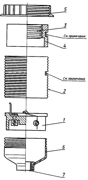 Рисунок 13 - Испытательные цоколи А и В для патронов Е14 1 - твердая сталь; 2 - острые кромки притупить * Размеры резьбы испытательного цоколя должны иметь минимальные значения с допуском ±0,05 мм, указанные в стандартном листе 7004-21 МЭК 60061-1. Рисунок 14 - Испытательный цоколь для патронов Е27 1 - твердая сталь; 2 - острые кромки притупить * Размеры резьбы испытательного цоколя В должны иметь минимальные значения с допуском ± 0,05 мм, указанные в стандартном листе 7004-24 МЭК 60061-1. Рисунок 15 - Испытательный цоколь для патронов Е40 1 - сферическая поверхность R4 ± 0,05; 2 - скруглить все края; 3 - ограничивающая поверхность; 4 - рукоятка; 5 - предохранитель; 6 - изолирующий материал; 7 - шарниры; 8 - цилиндрическая поверхность R2 ± 0,05 Материал - металл, если не указано иное. Предельные отклонения на размеры, не указанные на рисунке: до 25 мм включ. +0/-0,05 мм св. 25 мм ±0,2 мм угловые +0/-10' Оба шарнира должны допускать вращение в одной и той же плоскости и в одном направлении на угол 90° с допуском от 0 до 10°. Рисунок 16 - Стандартный испытательный палец (соответствующий МЭК 60529) Слой песка и гравия для регулирования проникновения воды. Они разделены металлической сеткой (решеткой) и промокательной бумагой. Примечание - Опора должна быть меньше испытуемого оборудования. Рисунок 17 - Установка для проверки защиты от капель воды Рисунки показывают только типовые детали патрона и не определяют конструкцию 1 - сборка зажим/контакт; 2 - наружный корпус; 3 - резьбовая гильза; 4 - изолирующее кольцо; 5 - абажурное кольцо; 6 - донышко; 7 - резьбовой ввод Примечание - На рисунке детали 2 - 4 последовательно соединяют между собой. В других конструкциях детали 1 и 3 могут быть выполнены как одно целое. Рисунок 18 - Иллюстрация некоторых определений