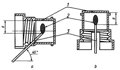 1 - образец; 2 - паз (щель) Для патронов Е14 и Е27 паз шириной 5 мм предназначен для ввода иглы и вентиляции. Для патронов Е40 паз не нужен. Рисунок а показывает, как проводить испытание игольчатым пламенем боковой контактной поверхности (не применимо к патронам Е40). Рисунок b показывает, как проводить испытание игольчатым пламенем центральной контактной поверхности. Минимальная длина иглы 35 мм. 1 - испытуемая поверхность; 2 - пламя; 3 - игла Рисунок 19 - Подготовка образцов для испытания игольчатым пламенем по 20.4 ПРИЛОЖЕНИЕ В(справочное) Соответствие стандартов МЭК государственным стандартам