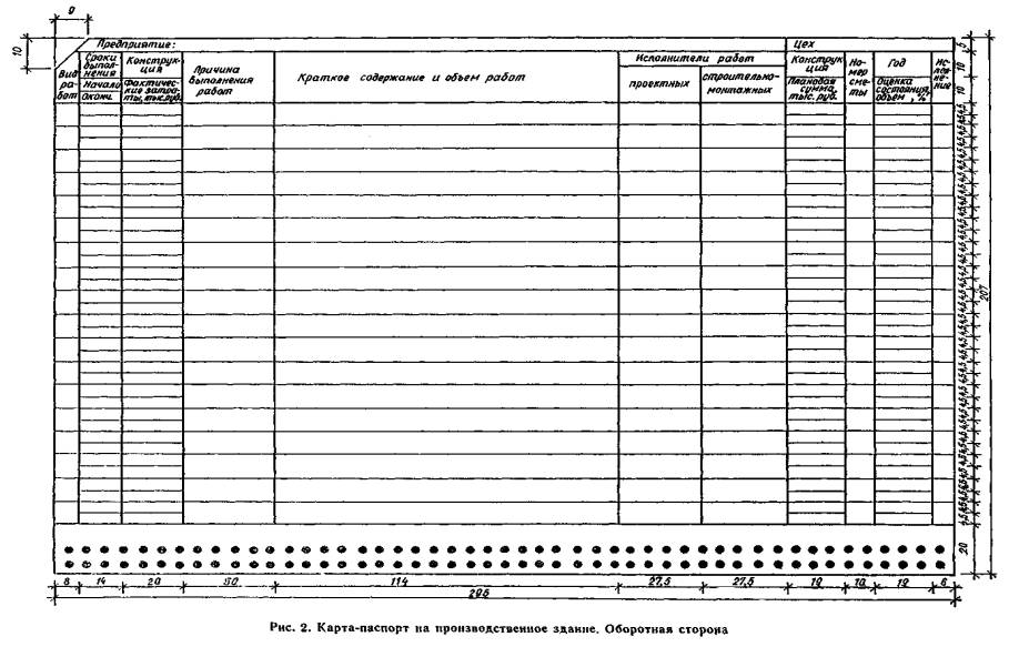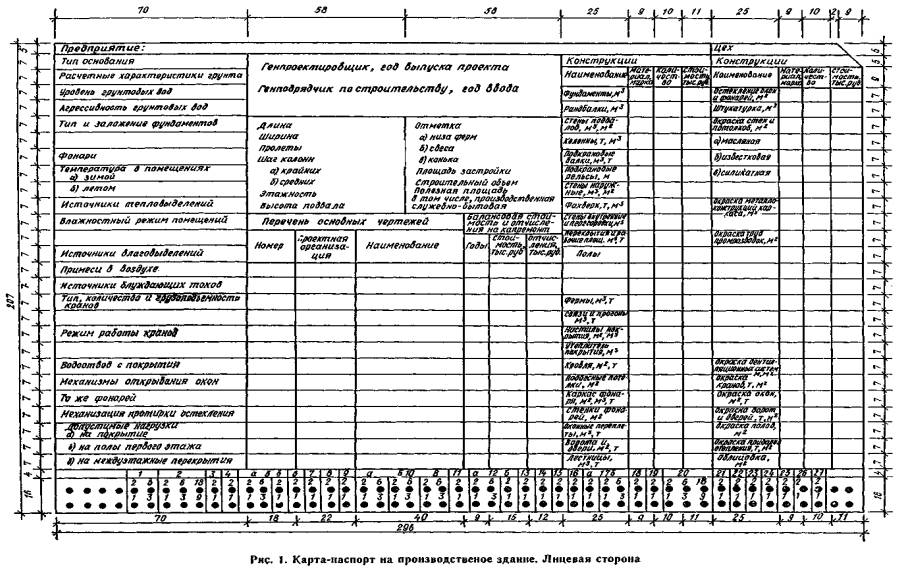 ПРИЛОЖЕНИЕ 7РЕКОМЕНДУЕМАЯ КАРТА-ПАСПОРТ НА ПРОИЗВОДСТВЕННОЕ ЗДАНИЕУказания по заполнениюВ графах лицевой части рис. 1 указываются: «Предприятие» - сокращенное наименование предприятия. «Цех» - сокращенное наименование здания (части здания), на которое составляется карта-паспорт или его условный шифр; «Генпроектировщик, год выпуска проекта» - сокращенное наименование проектной организации, разработавшей строительную часть проекта, и год выпуска основных чертежей; если в разработке строительной части участвовало несколько организаций, указывается ведущая; если здание строилось в несколько очередей, проектировавшихся различными организациями, перечисляются все организации с указанием года выпуска проекта после каждой из них. «Генподрядчик по строительству, год ввода» - сокращенное название строительной организации, выполнявшей функции генерального подрядчика при строительстве, и год ввода здания (части здания) в эксплуатацию; графа заполняется аналогично предыдущей. «Длина», «Ширина» - размеры каждого из блоков здания. «Пролеты» - последовательно количество пролетов и их величину для каждого из блоков здания (например, для здания, имеющего три последовательно расположенных пролета по 12 м, один - 18 м и далее два по 12 м, следует записать: 3×12 + 1×18 + 2×12). «Шаг колонн» - шаг колонн по наружным и внутренним рядам в каждом из блоков здания. «Этажность» - последовательно, снизу вверх, количество этажей равной высоты и их высоту в каждом из блоков здания (например, для пятиэтажного здания с первым и верхним этажами высотой 7,2 м и промежуточными этажами высотой по 4,8 м следует записать 1×7,2 + 3×4,8 + 1×7,2). «Высота подвала» - высоту подвала, если она постоянна, и высоты основных подвальных помещений, имеющих разную высоту. «Отметка» - перечисленные в форме карты отметки для различных блоков здания. «Тип основания» - естественное, искусственно уплотненное, химически или термически закрепленное и т.д. «Расчетные характеристики грунта» - принятое при проектировании расчетное давление на грунт основания Р в соответствующих единицах измерения, давление на грунт от действующих нагрузок р и др.; «Уровень грунтовых вод» - наивысший уровень грунтовых вод, измеренный от отметки пола первого этажа. «Агрессивность грунтовых вод» - вид возможной коррозии бетона и степень агрессивного воздействия грунтовых вод на бетон в соответствии с классификацией главы СНиП по защите строительных конструкций от коррозии. «Тип и заложение фундаментов» - ленточные, плитные, столбчатые или свайные фундаменты, глубокие опоры, и т.д. и пределы изменения глубин заложения фундаментов, измеренных от отметки пола первого этажа. «Фонари» - наличие и тип фонарей (прямоугольные, шедовые, зенитные из силикатного стекла и т.д.). «Температура в помещениях» - фактические характерные пределы изменения температур воздуха в основных производственных помещениях. «Источники тепловыделений» и «Источники влаговыделений» - наличие и перечень технологического оборудования, являющегося источником повышенных выделений, соответственно тепла и влаги. «Влажностный режим помещений» - фактический влажностный режим воздуха в основных производственных помещениях в зимний и переходные периоды в соответствии с классификацией главы СНиП по строительной теплотехнике (при относительной 