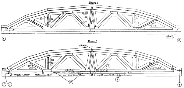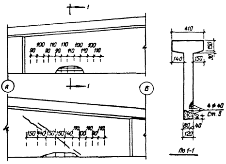 ВЫВОДЫ: 1. Несущая способность балки в середине пролета по изгибающему моменту, с учетом уточненных параметров, составляет 154 тм, т.е. достаточна для восприятия внешнего момента 100 тм от реальных нагрузок покрытия здания. 2. Разрушение свеса верхней полки, образовавшееся в 3 м от опоры, имеет характер механического повреждения, которое могло быть допущено при транспортировании или монтаже балки. Поверочный расчет, выполненный с учетом имеющегося ослабления полки, показывает, что несущая способность балки по этому сечению достаточна для восприятия внешнего изгибающего момента от нагрузки на покрытие здания. 3. Несущая способность балки по поперечной силе при прочности бетона 161 кгс/см2 (Rи = 141 кгс/см2) и шага хомутов 11 см составляет 35,6 т и достаточна для восприятия усилий от реальных нагрузок покрытия. В случае снижения прочности бетона до 112 кгс/см2 (Rи = 98 кгс/см2), при том же шаге хомутов, прочность балки понизится до 29,4 т, но еще не достигнет минимального предела 27,1 т. 4. При прочности бетона 112 кгс/см2 и хомутах Æ 12 А-II, с шагом 15 см, несущая способность наклонного сечения балки, начинающегося от края опоры, составила бы 25 т. Даже если принять расчетное сопротивление арматуры хомутов равным 2150 кгс/см2, то несущая способность составит 26 т и будет недостаточна [19]. Имеющаяся в натуре сильно раскрытая наклонная трещина начинается, примерно, на расстоянии 2 м от опоры, где рабочая высота сечения равна 75 см. Несущая способность по наклонному сечению на этом участке, при прочности бетона 112 кгс/см2 и шага хомутов 15 см, составляет около 30 т. 5. Большее раскрытие трещин на одной стороне балки объясняется увеличенным боковым защитным слоем бетона, за счет сдвижки арматурного каркаса к другой стороне. Фактическая величина раскрытия трещин в балке несколько больше величин, определенных расчетом. Наибольшее расхождение получилось в определении величины раскрытия наклонной трещины. Причиной ее образования могла быть недостаточная прочность бетона в момент загрузки балки; во всяком случае трещина выявила наиболее слабый участок конструкции и по прочности бетона и по поперечному армированию. Согласно указаниям по проведению обследований балок серии ПК-01-05, имеющиеся в балке трещины не превышают величин, допустимых для этого типа конструкций. Лишь на участке балки у опоры Б раскрытие косой трещины превышало допустимую величину. РЕКОМЕНДАЦИИ Для обеспечения дальнейшей надежной эксплуатации конструкции следует выполнить следующие мероприятия: 1) Опорный участок балки на длине проекции наклонной трещины раскрытием 0,8 - 1,0 мм усилить, согласно серии ПК-01-05 вып. 2, наружными хомутами из стержней Æ 16 мм Ст. 3, с шагом 20 см. Включение в работу обеспечивается натяжением болтов (рис. 12а). 2) Участок верхней полки на длине поврежденного свеса следует отремонтировать обоймой из двух швеллеров, охватывающих полку по бокам, с тщательным пробетонированием полости между ними (рис. 12б). Предварительно этот участок очистить от пыли, побелки, штукатурки, отслаивающегося бетона. Затем промыть водой под давлением и только после этого монтировать швеллера, которые будут служить одновременно опалубкой и конструкцией усиления. II. Предварительно напряженные подстропильные балки пролетом 12 мНа одном из заводов железобетонных изделий было проведено обследование предварите