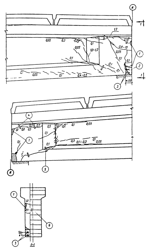Некоторые обследователи, не уверенные в правильности своей оценки прочности бетона, рассматривают полученную ими величину фактической прочности как марку бетона, принимая для поверочных расчетов значения Rпр, Rи, Rр, Rt по таблице расчетных сопротивлений бетона, которая учитывает понижающие коэффициенты однородности, принятые в СНиПе на основании общей статистической возможной изменчивости свойств этого материала по сравнению с исходными нормативными значениями. Принимая, например, за марку бетона фактически определенную в конкретной конструкции прочность 300 кгс/см2, а с учетом погрешности показаний прибора - Rб = 210 кгс/см2. По таблице расчетных сопротивлений СНиП находят: Rпр = 85 кгс/см2 и Rи = 106 кгс/см2. Подобная перестраховка особенно недопустима в тех случаях, когда прочность бетона имеет решающую роль для оценки состояния элементов, а искусственное занижение прочности бетона в расчете может привести к неоправданному усилению конструкции. Прочность бетона может быть разной не только в различных элементах, но даже в пределах одного элемента. При значительной неоднородности бетона величина кубиковой прочности, вводимой в поверочный расчет, принимается в зависимости от состояния и условий работы конструкции или ее элемента. Выявленные при обследовании наихудшие показатели прочности бетона в одной конструкции или на одном ее участке нельзя механически распространять на всю конструкцию или на другие конструкции объекта. В ведомостях дефектов или в специальной таблице следует указывать участки, на которых определена величина прочности бетона. Это необходимо для последующего детального анализа состояния конструкции. VI. Выяснение фактического армированияВсе данные об армировании конструкций содержатся в рабочих чертежах и документах завода-изготовителя. В заводских паспортах изделий, актах скрытых работ, картах пооперационного контроля, журналах арматурных работ и других материалах обычно имеются данные о количестве, диаметре и классе арматуры, сведения о ее заменах, пересчетах арматуры, стыках стержней, способах и контроле предварительного упрочнения арматуры, результатах испытания стыков, величине и контроле предварительного напряжения арматуры в изделиях, об анкерных устройствах, закладных деталях и прочее. Обследование заключается в сборе и в ознакомлении с этими данными, сопоставлении их с проектом и выборочной проверке (в характерных местах) фактического армирования проектному. Если заводские данные об изготовлении и армировании отсутствуют, а состояние конструкции вызывает сомнение в качестве армирования, то производят выборочное вскрытие бетона с обнажением арматуры. Для вскрытия бетона используют места повреждений защитного слоя, сколы бетона, трещины, рыхлые и пористые участки. Зафиксированные оголения арматуры, с соответствующими замерами, используются для характеристики фактического армирования. Местное нарушение защитного слоя бетона на участке до 5 - 15 см допускается в некоторых растянутых элементах или зонах конструкций. Например, можно отбить нижний защитный слой бетона, оголив на небольшом участке рабочую арматуру в средней зоне непреднапряженных балок; в неразрезных балках можно вскрыть верхнюю надопорную арматуру; возможно отбить защитный слой, оголив стержни растянутого рас
