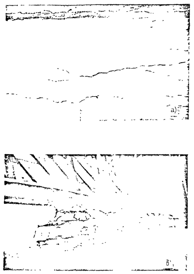 5. При выполнении поверочных расчетов необходимо учитывать технологические особенности производственной среды, которые предъявляют дополнительные требования к строительным конструкциям. При отсутствии химзащиты для обычных конструкций работающих в условиях высокой влажности (свыше 75 %) без агрессивных газов или в условиях повышенной влажности и слабоагрессивных газов, а также в условиях сильноагрессивной среды, но при наличии химзащиты допускается ширина раскрытия трещин не более 0,2 мм. Расчет таких конструкций производится по раскрытию трещин. Для предварительно-напряженных конструкций, работающих в условиях сильноагрессивных сред, образование трещин не допускается. Расчет их производится по второй категории трещиностойкости. В проектах усиления или восстановления конструкций толщина защитного слоя арматуры назначается в зависимости от степени агрессивности среды и от вида химзащиты [27, 28, 29]. Пропитывание бетона строительных конструкций минеральными маслами - явление довольно частое. Даже очень плотные бетоны с течением времени промасливаются. Бетон, пропитанный минеральными маслами и охлаждающими эмульсиями, снижает свою прочность до 50 % против первоначальной, при этом нарушается сцепление арматуры с бетоном, что особенно сказывается в анкерных устройствах преднапряженных конструкций. Уже через полгода сцепление промасленного бетона с арматурой гладкого профиля уменьшается в два раза, а периодического профиля - на 20 - 25 %. В таких цехах создаются неблагоприятные условия для работы, просочившееся через толщу перекрытия масло пропитывает большие площади перекрытия, балки, колонны, капает на людей, оборудование, пол от масла становится скользким (рис. 6). Рис. 6. Участки междуэтажного перекрытия, пропитанные минеральными маслами. В этих случаях приходится к перекрытию подвешивать противни для сбора масла, а на полы насыпать древесные опилки. В большинстве случаев в проектах механических цехов не предусматривается устройство маслозащиты, что объясняется недооценкой действия на бетон и железобетон минеральных масел и охлаждающих эмульсий. Ниже приводятся примеры действия газовых и жидких производственных сред на строительные конструкции. За тринадцать лет эксплуатации несущих конструкций перекрытия механического цеха, в результате пропитки бетона и понижения его прочности до 75 - 100 кгс/см2 против 170 - 200 кгс/см2 несущая способность конструкции значительно снизилась. На другом предприятии за три года эксплуатации пропитано и требуют капитального ремонта 1000 м2 площади сборных железобетонных перекрытий цеха. За восемнадцать лет эксплуатации механических мастерских, реконструированных под новое химическое производство, произошла сильная коррозия бетона и арматуры колонн, главных и второстепенных балок перекрытия. В одних балках, с шириной раскрытия трещин до 7 мм (рис. 7а), арматура местами оголена и стержни прокорродировали на 4 мм; в других - защитный слой бетона отсутствует на 60 - 70 % площади (рис. 7б). В тех балках, где арматура не оголена, наблюдается ее коррозия, бетон карбонизирован, то есть потерял свою защитную способность на глубину 30 мм. Воздушная среда цеха характеризуется повышенной влажностью - более 75 %, температурой 25 - 30 °С и содержанием газов - HCl, NH3, HP, N2O5. Пары конденсировались на остеклении фон